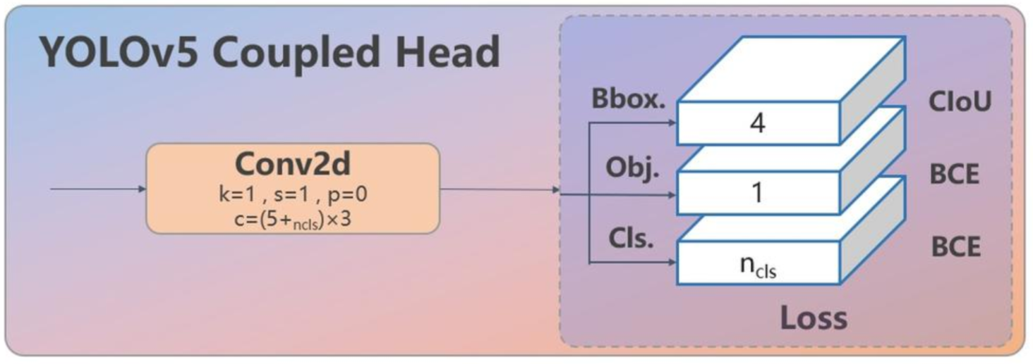 在传统的耦合头(如 YOLOv5)中,分类和边界框回归任务共享同一套特征,使用一个共同的输出分支来同时进行这两项任务的预测。如yolov5的结果输出:[x1, y1, x2, y2, conf, cls],