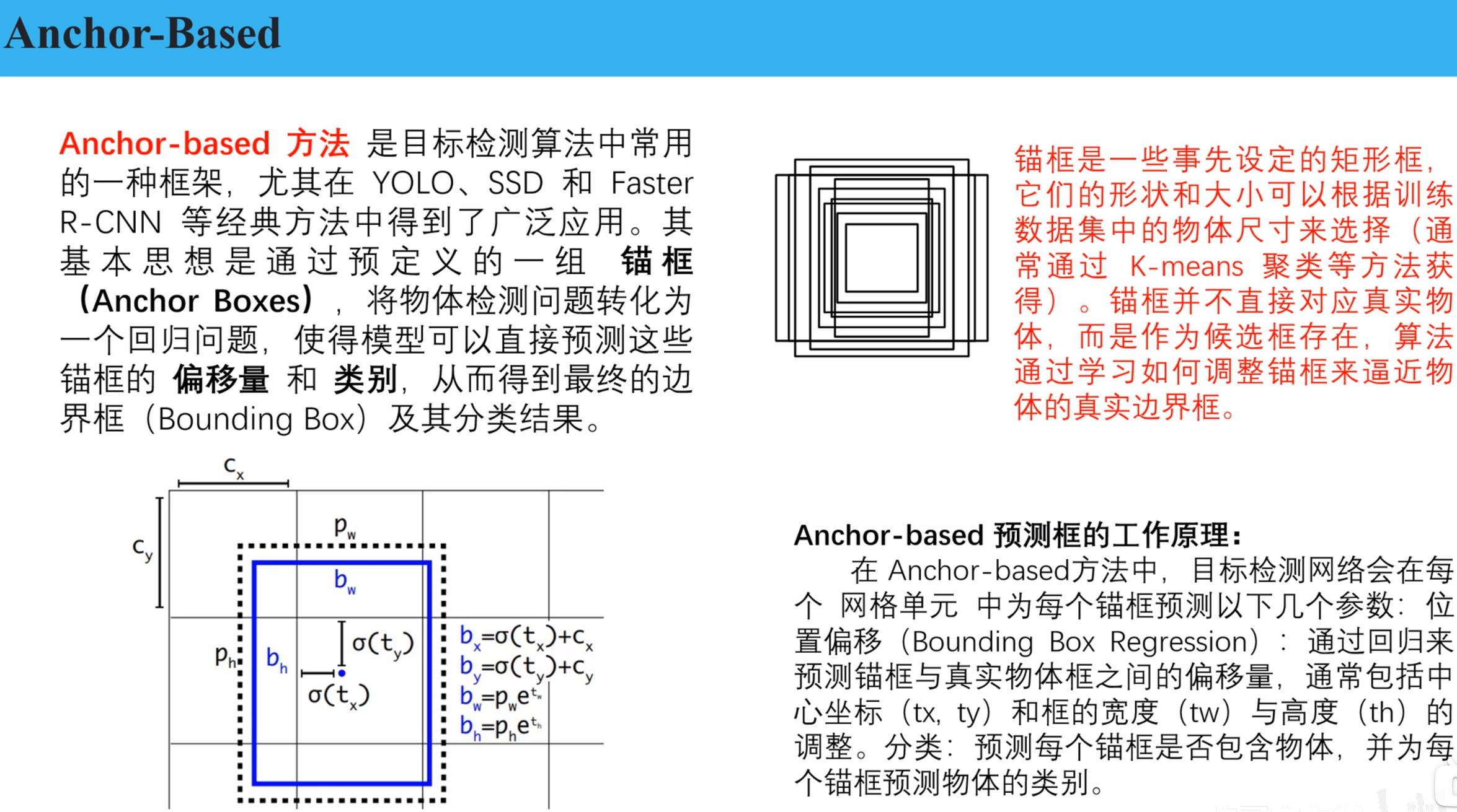核心思想:预先定义一组不同尺度、长宽比的锚框(Anchor Boxes),作为候选检测框,然后通过回归调整和分类筛选最终检测结果。