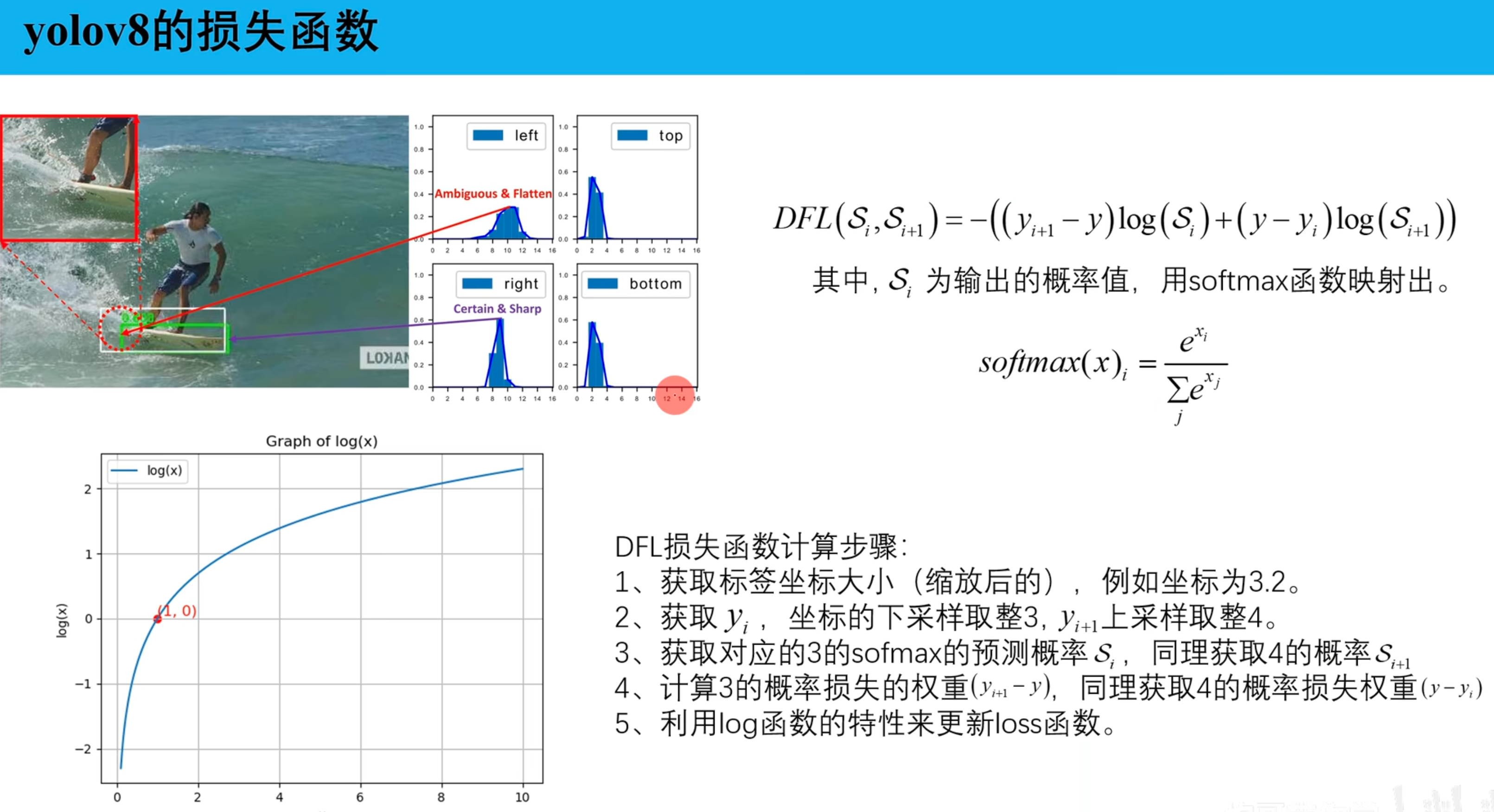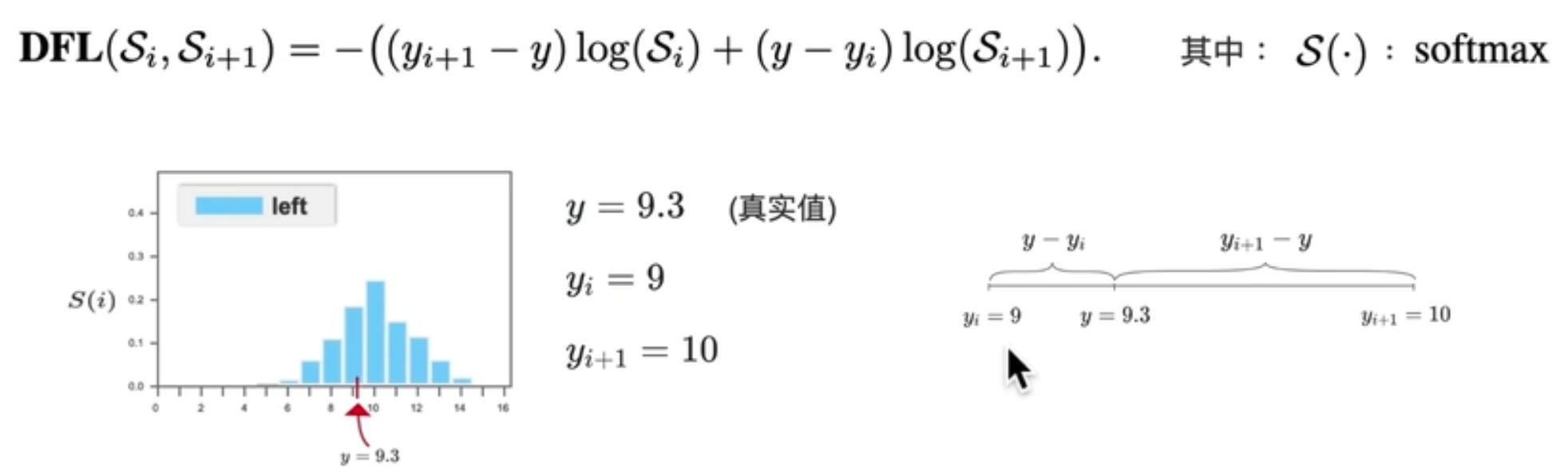 DFL 损失的核心思想是:首先确定真实值,如9.3,然后找到预测值中真实值上下两个整数坐标,如9.3向下取整是9,向上取整是10,找到这两个坐标以及对应的预测值。最后通过以上公式去计算损失。