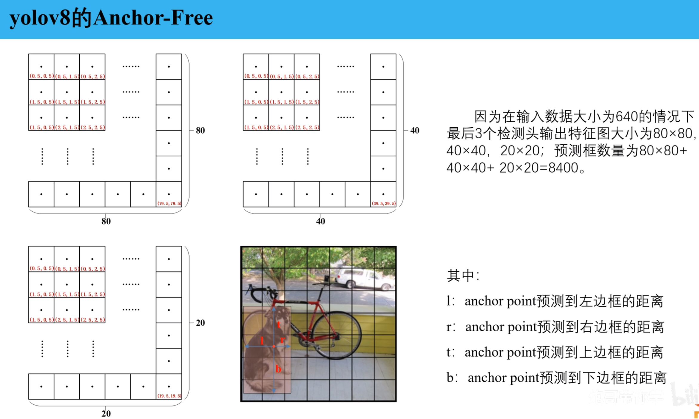 yolov8中预测框的输出是以anchor_point为基准的的,每一个anchor_point 都会输出一个预测框,一共是8080+4040+20*20个