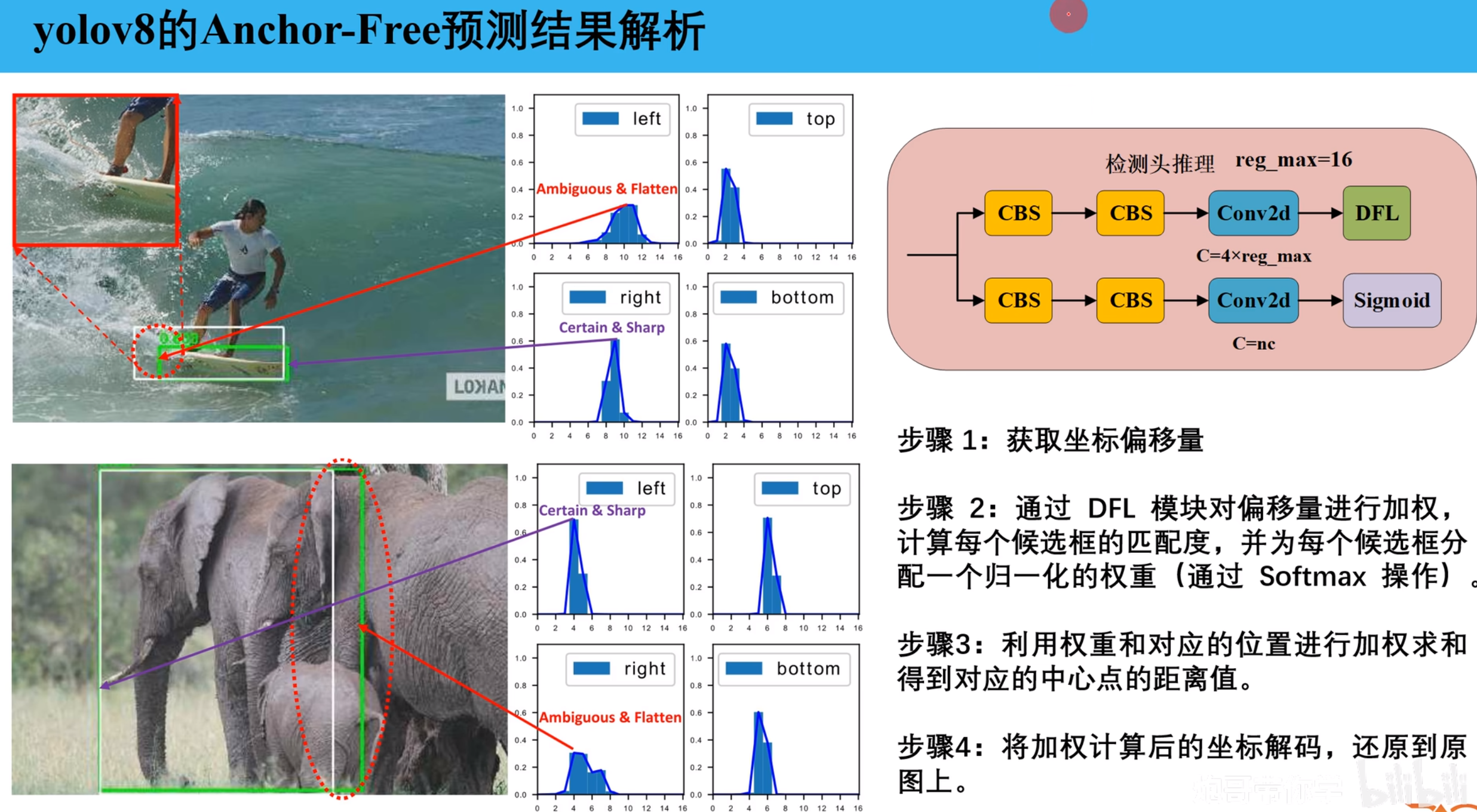 将边界框回归建模为分类任务(离散化宽高分布),提升定位精度,尤其对模糊边缘有效。而 YOLOv5 使用 CIoU 损失,依赖 Anchors 的初始位置,可能受限于 Anchors 的质量。 - 分类与定位的解耦: