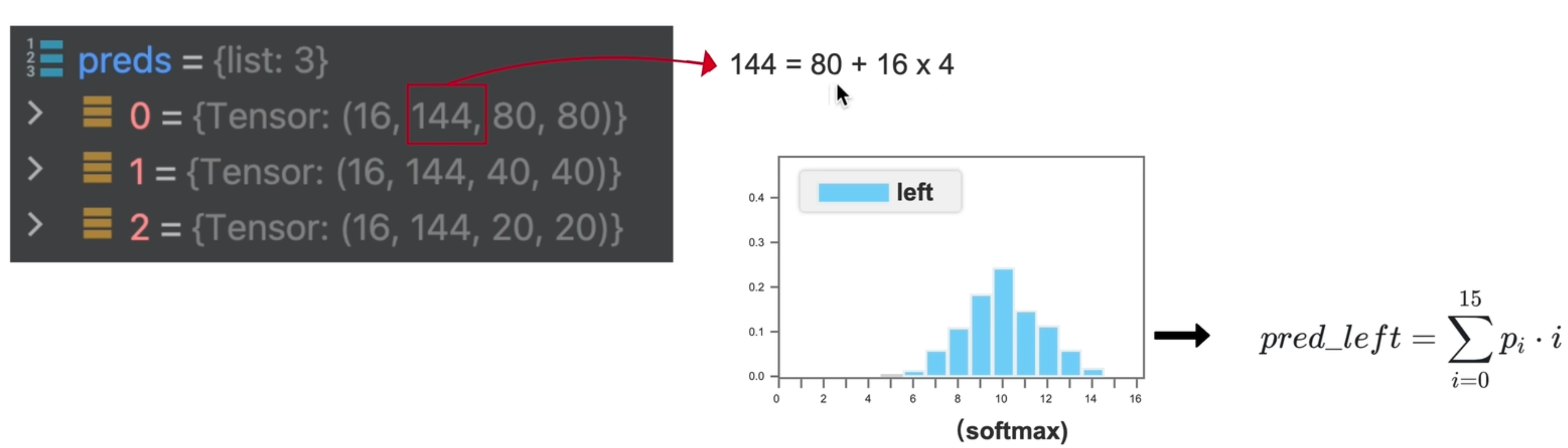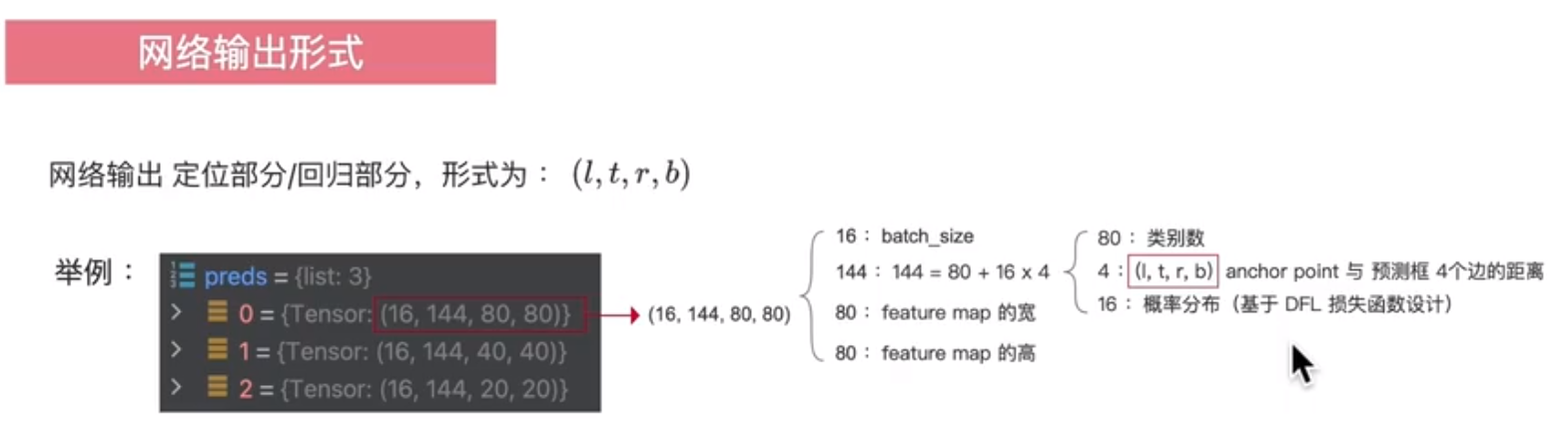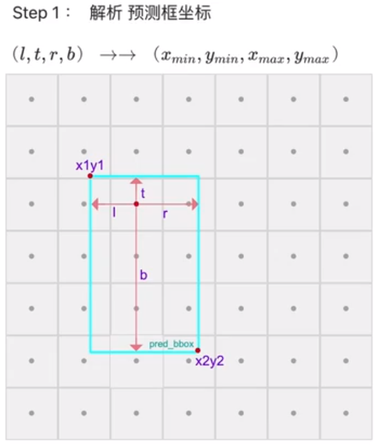 网络部分的输出是ltrb,即预测框相对于anchor point 的上下左右范围,会进一步处理成一个x1,y1,x2,y2的形式。