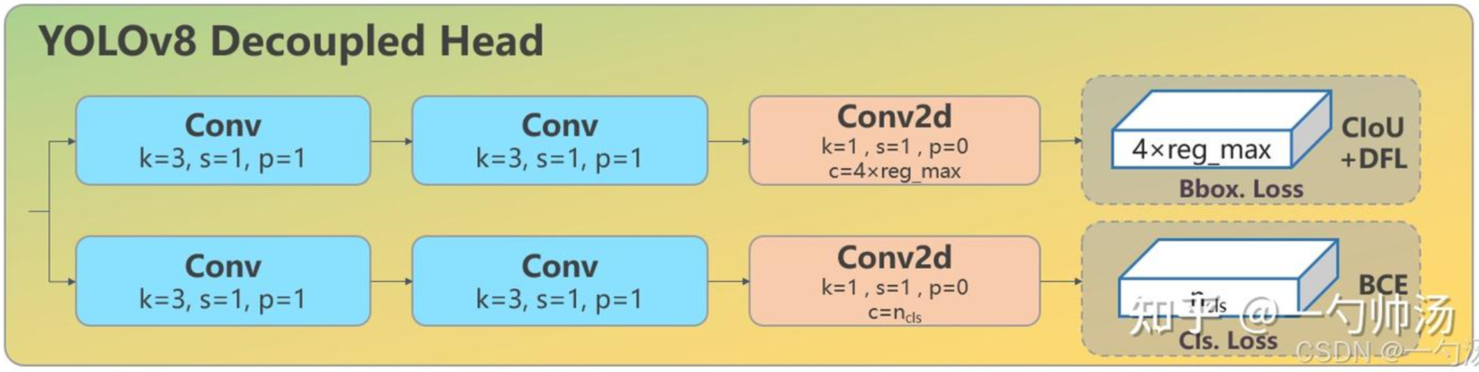 而yolov8采用的是解耦头,类别概率和预测框结果分为两个检测头输出,实现如下: