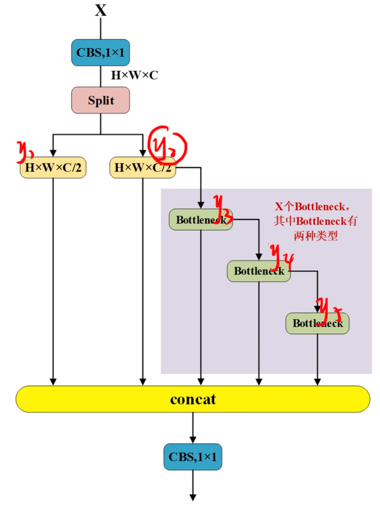 - Concat:将所有Bottleneck模块的输出以及之前分割的特征图进行拼接,增加特征的多样性。