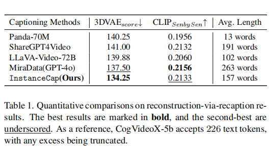 - InstanceCap在指标上优于其他方法或与其他方法相当,表明其提升视频与字幕之间保真度的能力。