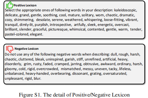 - 正负词典引导(Positive/Negative Lexicon):使用预构建的词典引导LLM生成更具美感的描述,避免使用负面词汇。