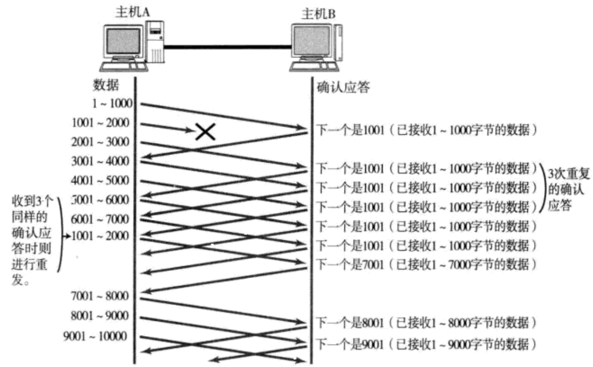 果发送端主机连续三次收到了同一个 1001这样的应答,就会将对应的数据 1001 - 2000重新发送;