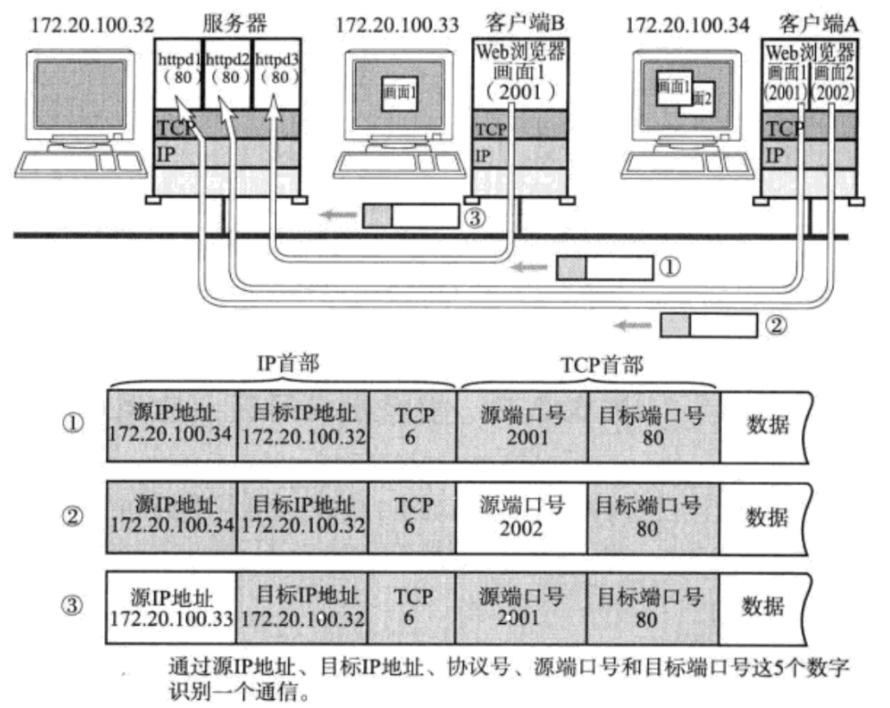 在TCP/IP协议中, ⽤ "源IP", "源端口号", "目的IP", "目的端口号", "协议号" 这样⼀个五元组来标识⼀个通信(可以通过netstat -n查看);