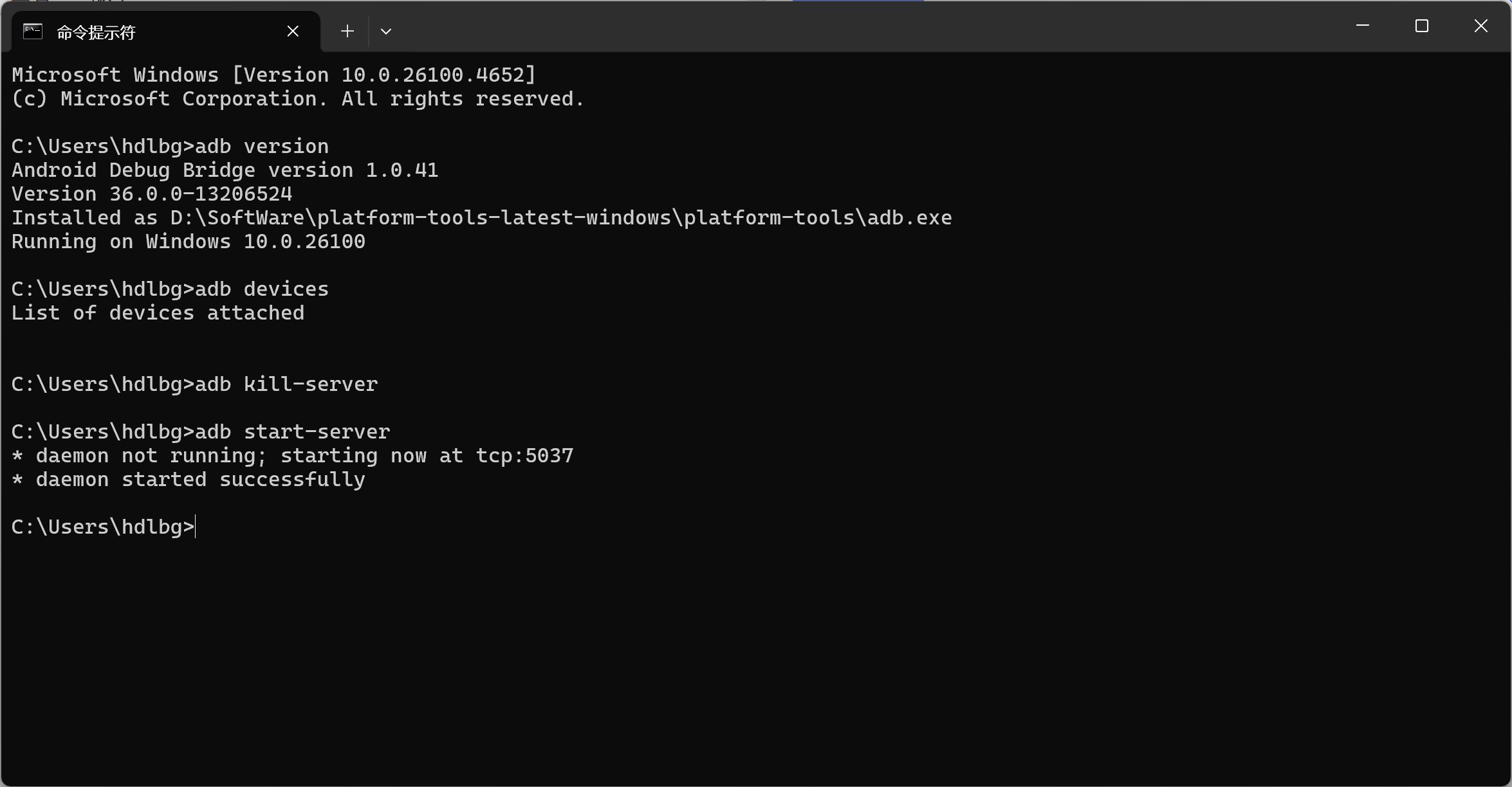 # 打开的cmd命令框# 查看版本 adb version # 查看设备列表 adb devices# 关闭服务 adb kill-server# 开启服务 adb start-server
