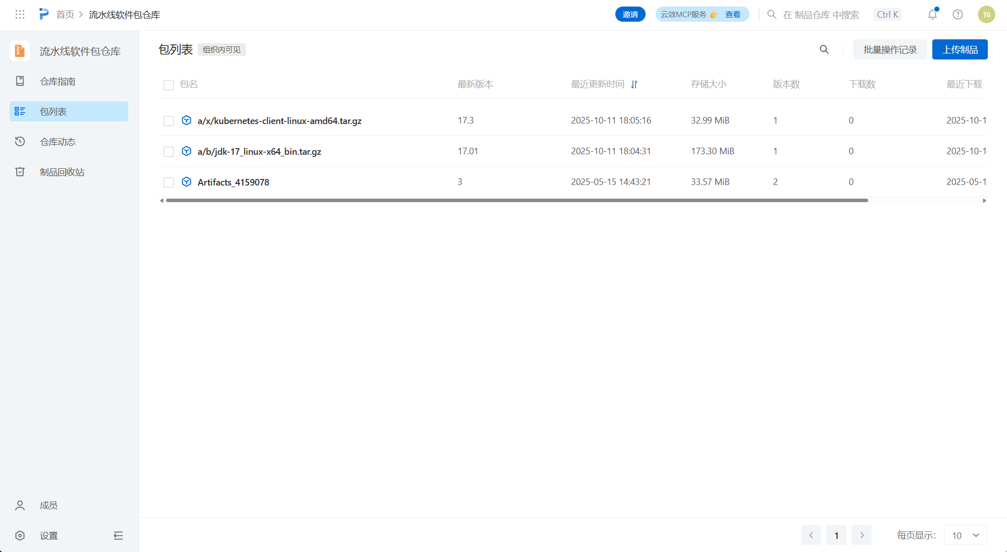 制品管理 | 支持从云效 Packages制品库下载制品。 | 支持集成TikLab DevOps套件Hadess上传、下载制品。 |