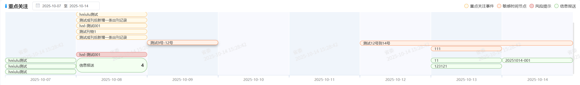 groupData = [{name: '事件类型1',backgroundColor:'', // 背景色borderColor:'', // 边框颜色noSummary:false, // 是否需要超过条合并events: [{start: '2025-10-01',end: '2025-10-04',title: '我是事件名'},{start: '2025-10-01',end: '2025-10-04',title: '我是事件名'},{start: '2025-10-01',end: '2025-10-04',title: '我是事件名'}]}]