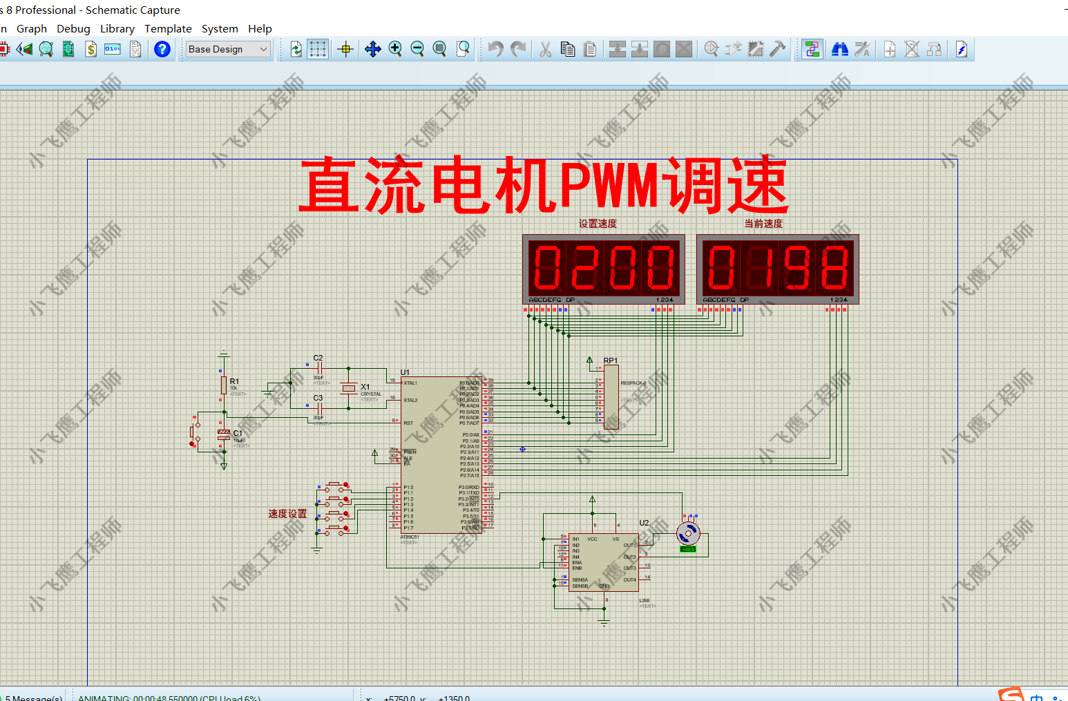 四个按键(加10,加1,减10,减1)设置速度初定值,并送4位共阴数码管显示;测量实时速度,送另一个4位共阴数码管显示。能利用产生占空比可调的PWM控制速度到达设定值,由此形成闭环PWM调速直流电机。