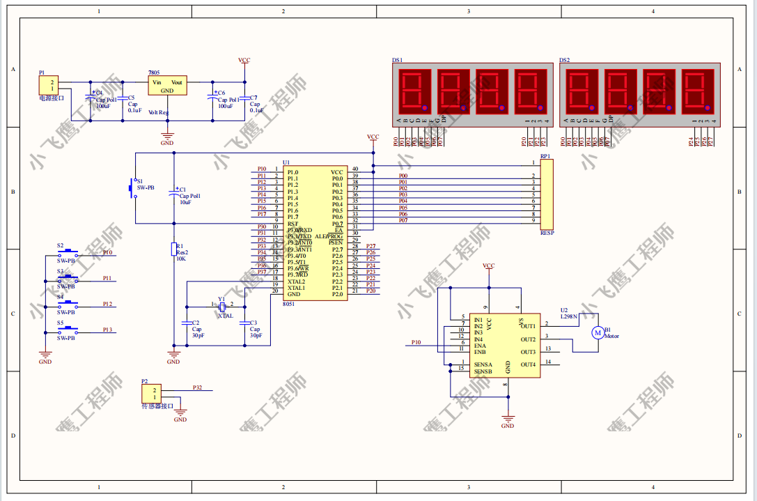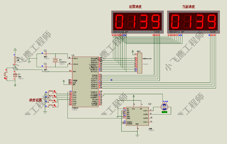 采用AT89C51单片机,晶振为12MHz,2个四位的共阴数码管,一个显示速度设定值,一个显示速度测量值,单位r/min;