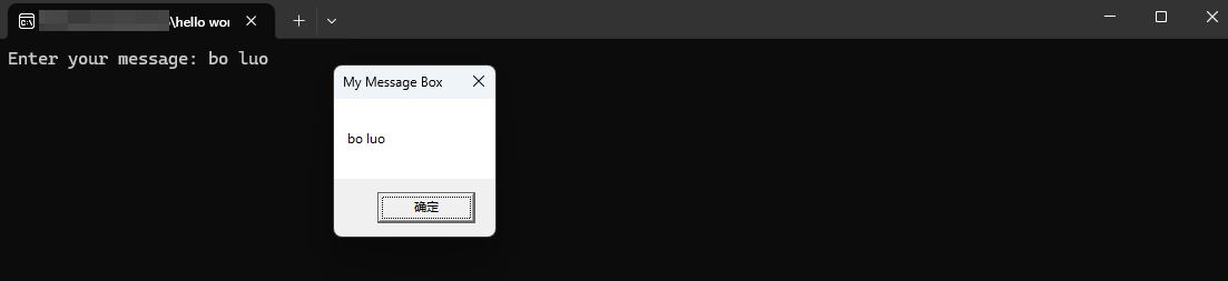 {// 关键声明:// [DllImport("User32.dll")]: 说明函数在 User32.dll 里// CharSet=CharSet.Unicode: 指定字符串使用 Unicode 编码// public static extern int: 声明一个外部静态方法,返回 int// MessageBox(...): 函数名和参数列表(必须和 DLL 里的函数原型匹配)[DllImport("User32.dll", CharSet = CharSet.Unicode)]public static extern int MessageBox(IntPtr h, string m, string c, int type);static int Main(){string myString;Console.Write("Enter your message: ");myString = Console.ReadLine();// 调用外部函数// 输入一段文字,然后弹出一个消息框显示这段文字return MessageBox((IntPtr)0, myString, "My Message Box", 0);}