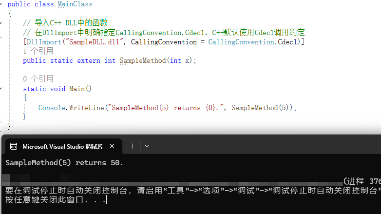 // cm.cs using System; using System.Runtime.InteropServices;public class MainClass {// 在DllImport中明确指定CallingConvention.Cdecl,C++默认使用Cdecl调用约定[DllImport("SampleDLL.dll", CallingConvention = CallingConvention.Cdecl)]public static extern int SampleMethod(int x);static void Main(){Console.WriteLine("SampleMethod(5) returns {0}.", SampleMethod(5));} }