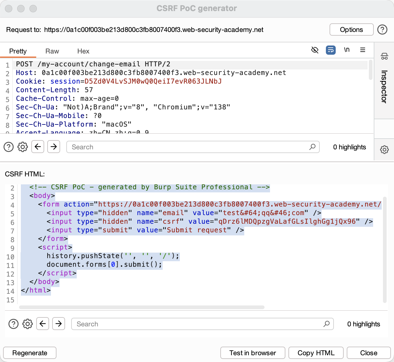 由于令牌不与会话绑定,直接使用自己账号(如 wiener)的 CSRF 令牌构造恶意表单即可: