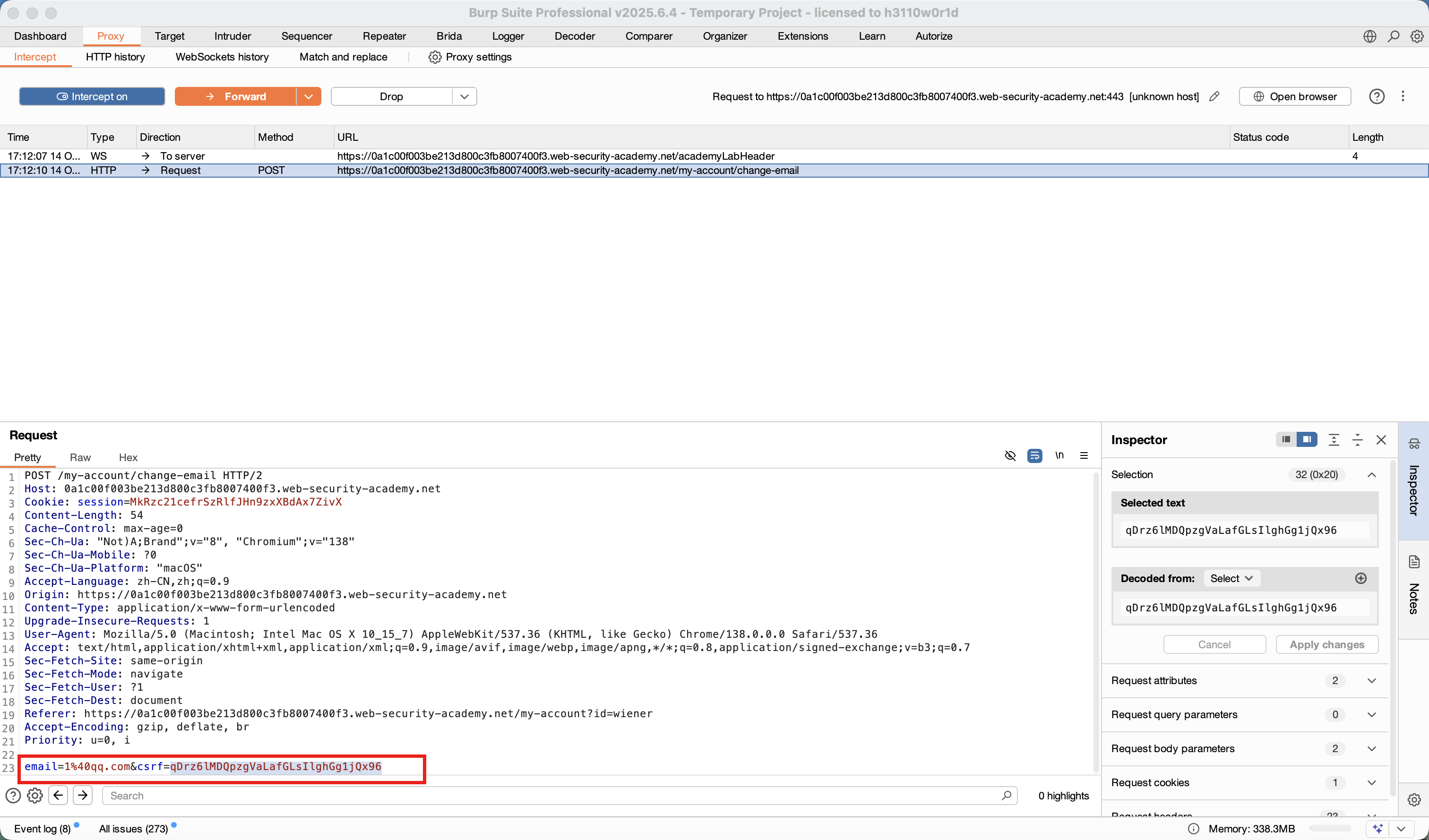 - 注意:令牌是 “一次性的”(使用后失效),测试时发现令牌无效,重新获取 wiener 账号的新令牌替换(csrf=tZ7RL9JwrbA0GKa3IfiXtGvf4XRoEjcw)