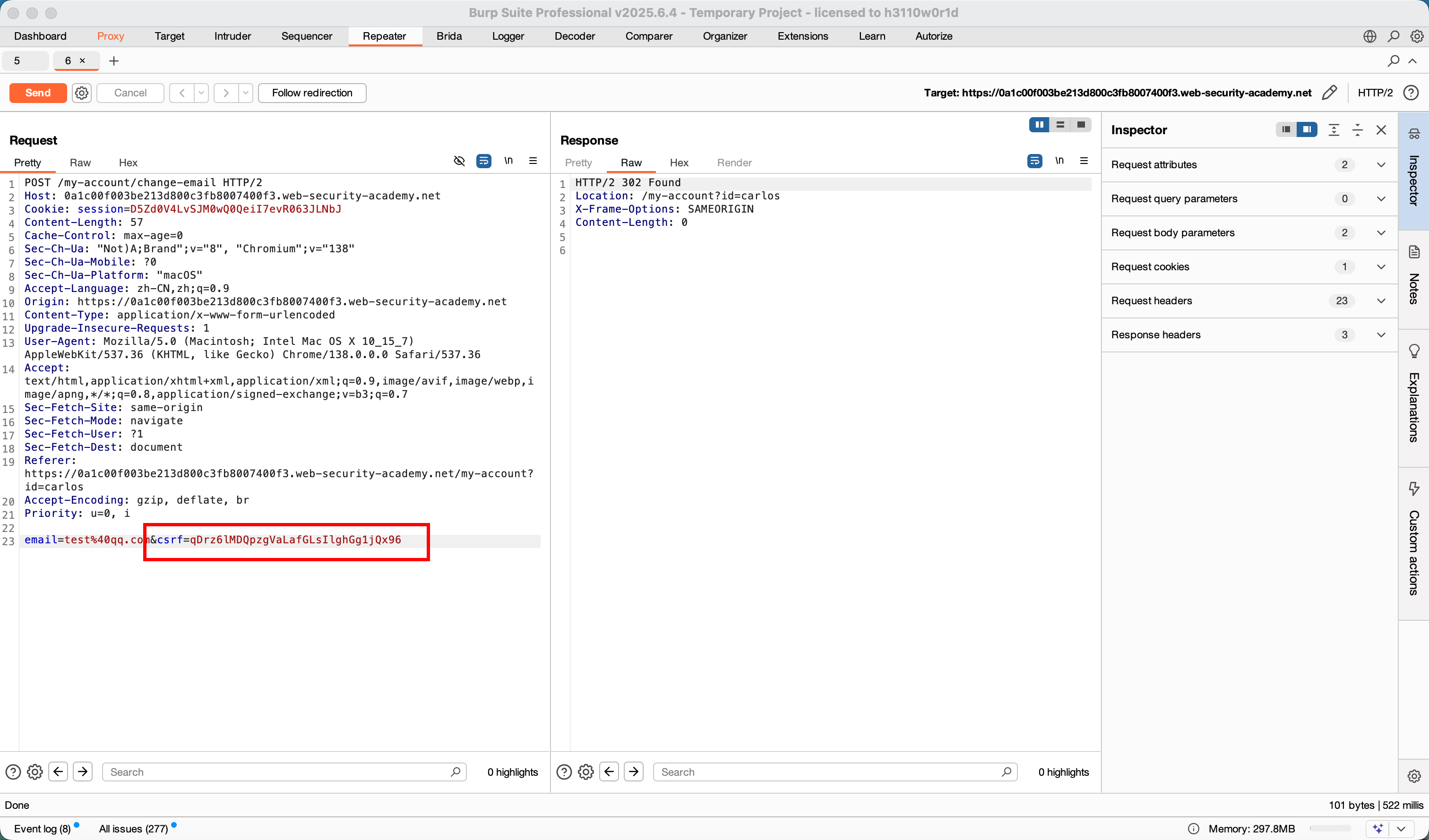 - 若服务器返回 302 重定向(跳转到账户主页),且查看 carlos 账号的邮箱已被修改,说明 令牌可跨会话复用(漏洞确认)。