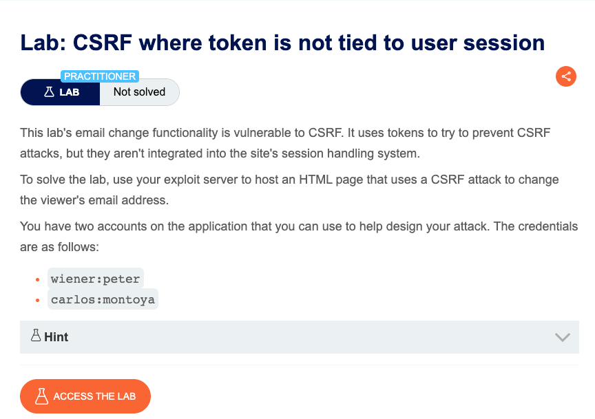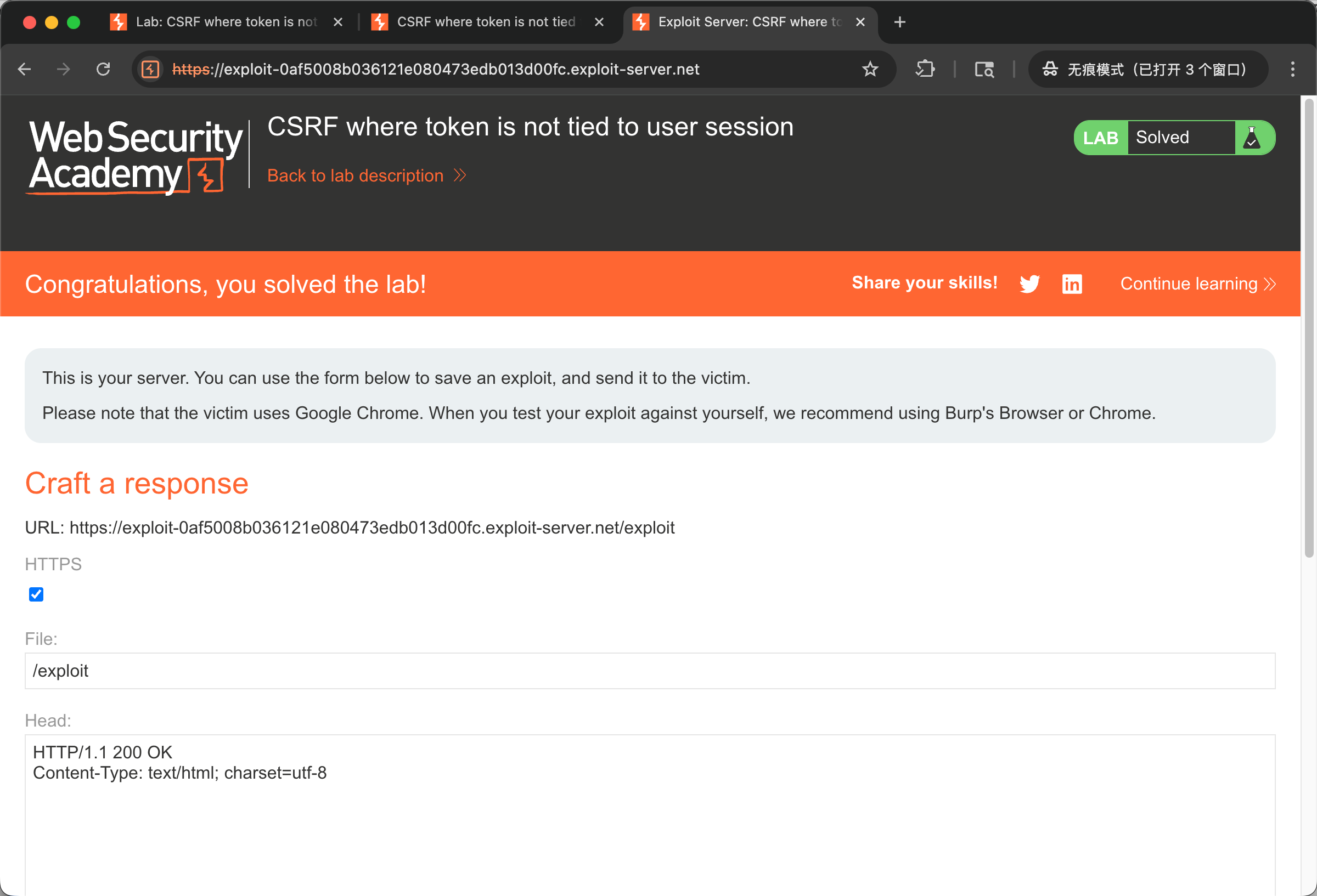 要解决 “令牌与用户会话不绑定的 CSRF” 靶场,核心在于核心核心是利用服务器的验证缺陷 ——CSRF 令牌未与用户会话绑定,导致攻击者可以复用其他用户的令牌发起攻击。以下从理论原理和实践步骤两部分详细说明: