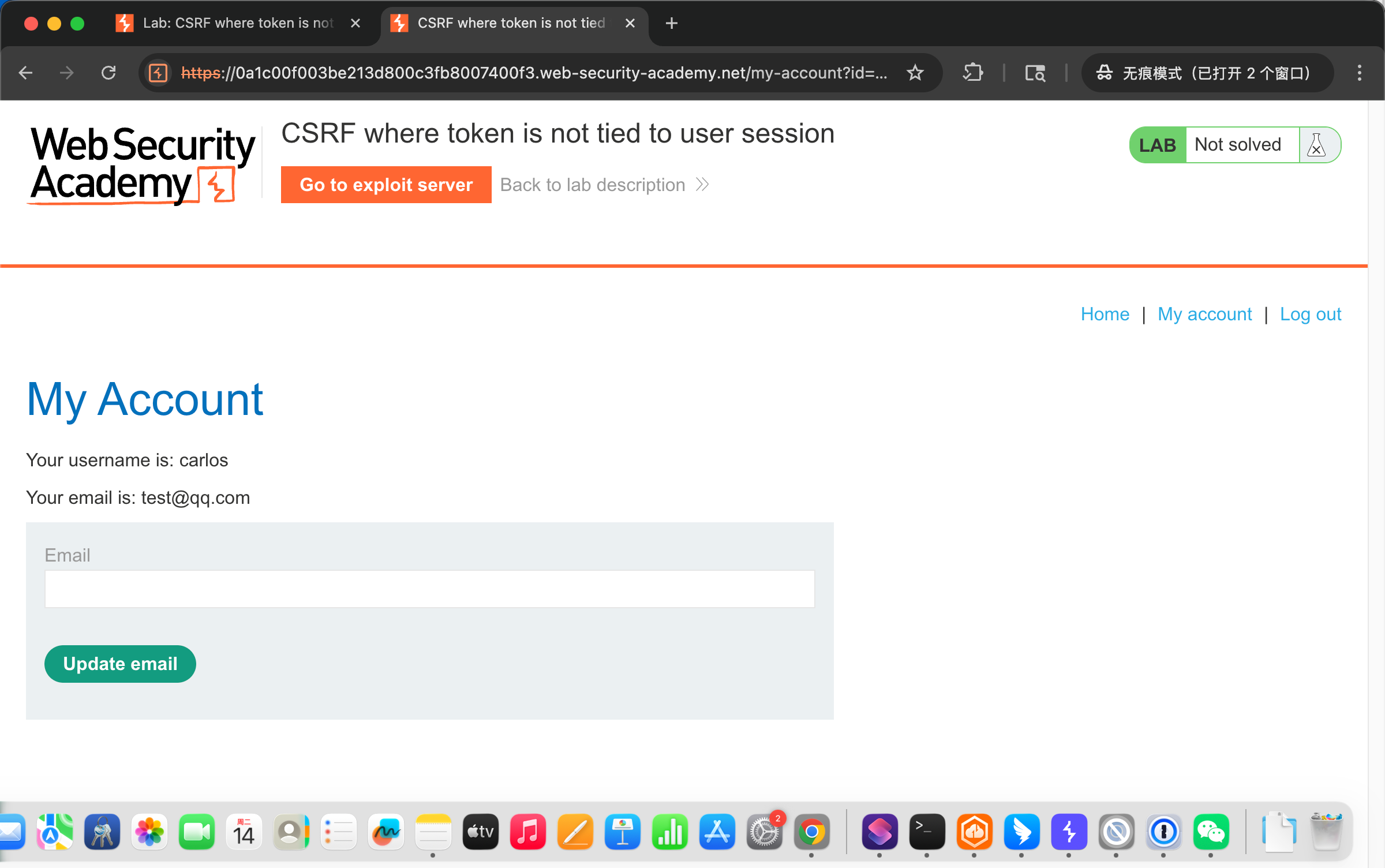- 查看 carlos 账号的邮箱确实被修改,说明恶意 HTML 有效(攻击者的令牌被受害者的会话接受)。