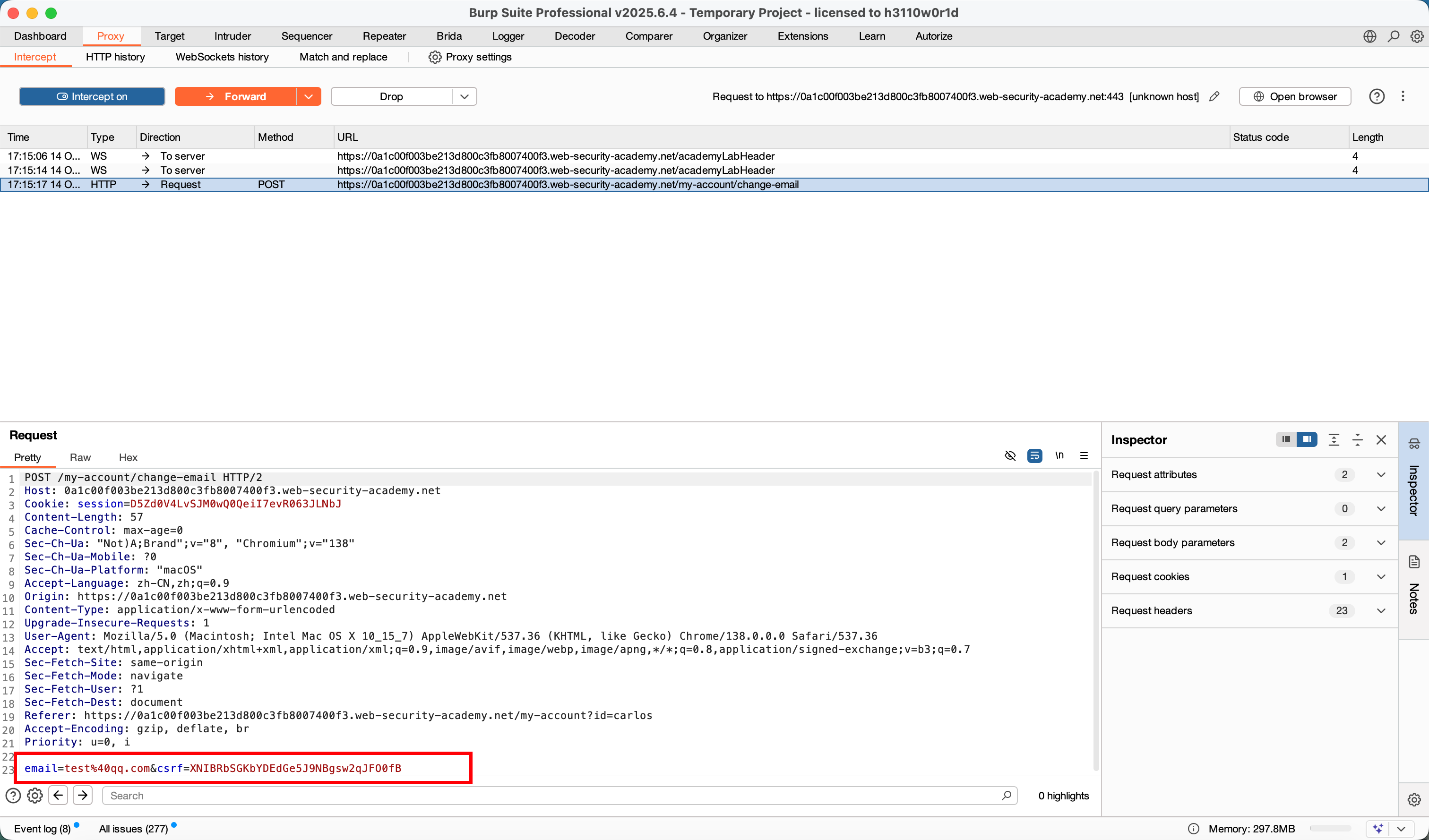 - 同样提交 “更改邮箱” 表单,拦截请求并记录其