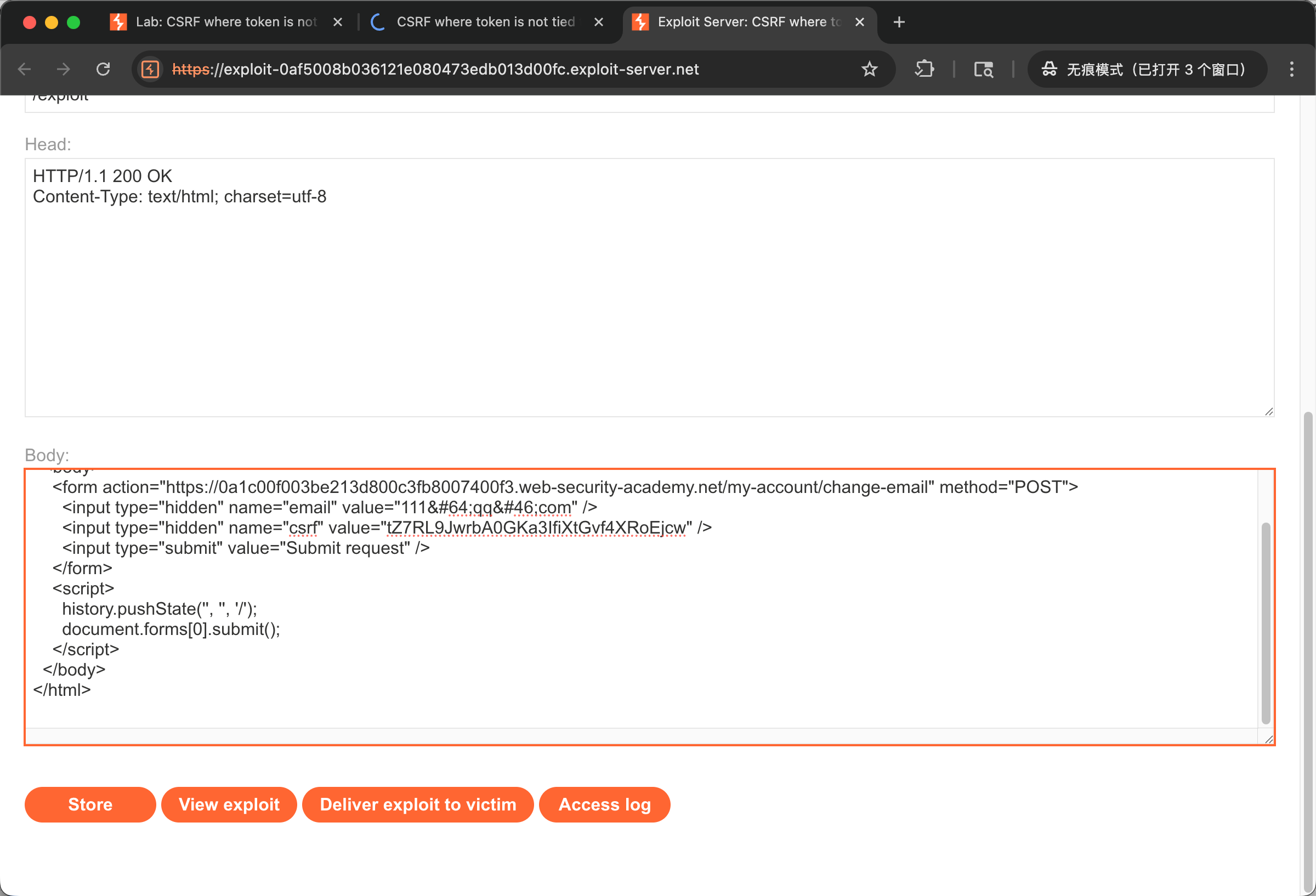 是未被占用的新邮箱(避免与测试邮箱冲突); - 若令牌是一次性的,重新获取 wiener 账号的最新令牌替换到 HTML 中,再次 “Store”;
