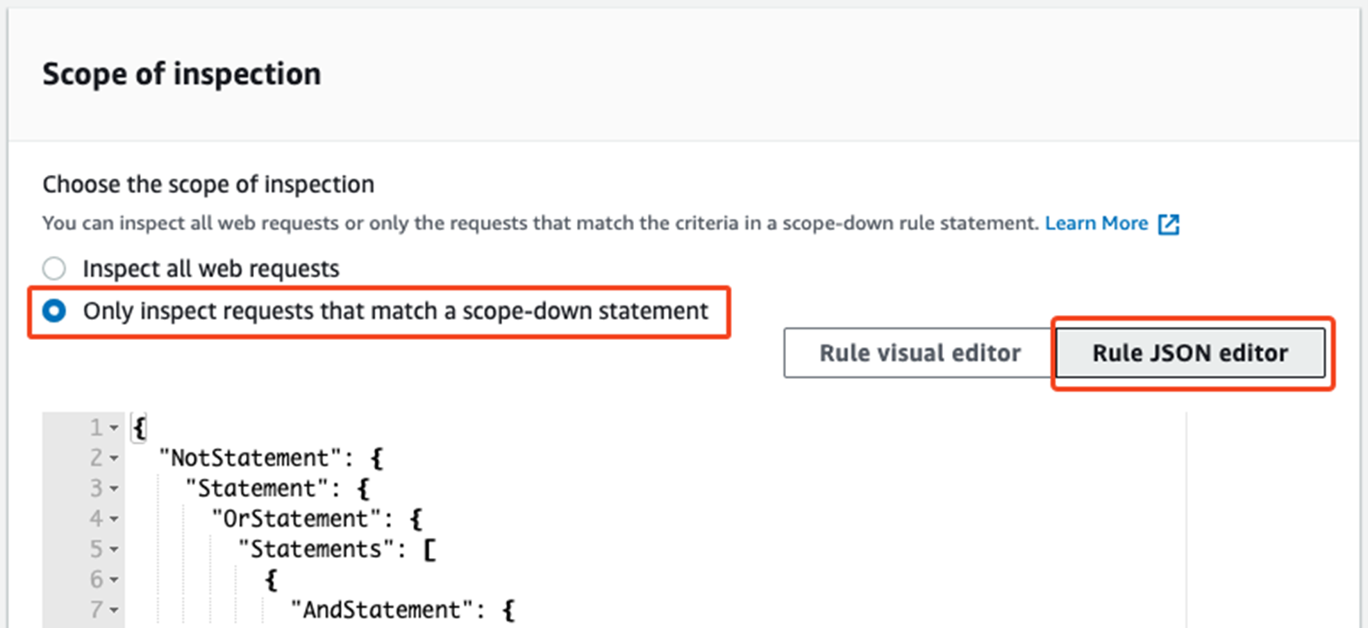 在 Scope of inspection 部分选择 Only inspect requests that match a scope-down statement