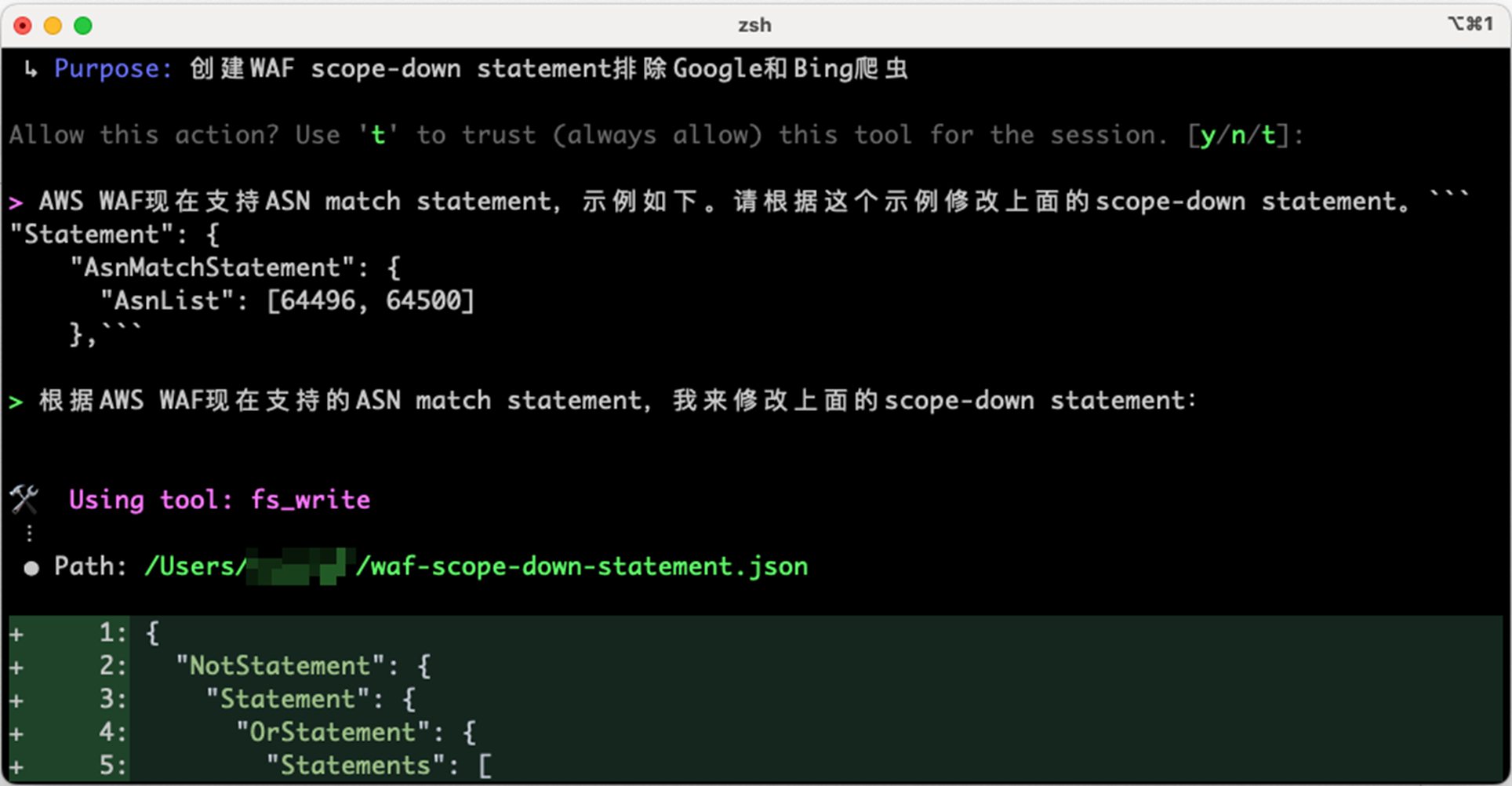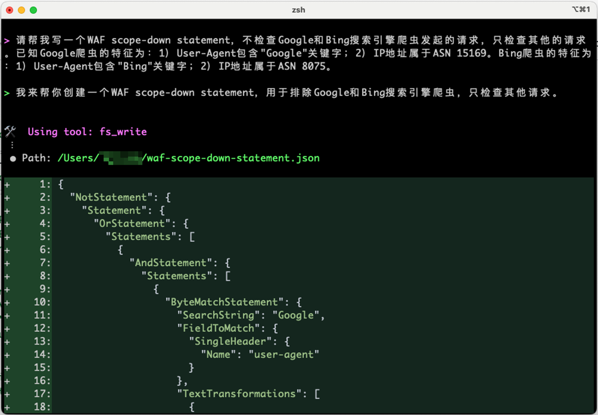 这种识别逻辑涉及复杂的多层嵌套条件判断,手工编写 JSON 规则既耗时又容易出错。使用 Amazon Q Developer CLI 可以大大简化这个过程。Amazon Q Developer CLI 是 Amazon Q 的命令行工具,Amazon Q 是一个由生成式 AI 驱动的助手。您可以使用它来询问有关 AWS 架构、资源和一般开发任务的问题。我们向 Q CLI 描述需求,让它生成相应的 WAF scope-down statement。
