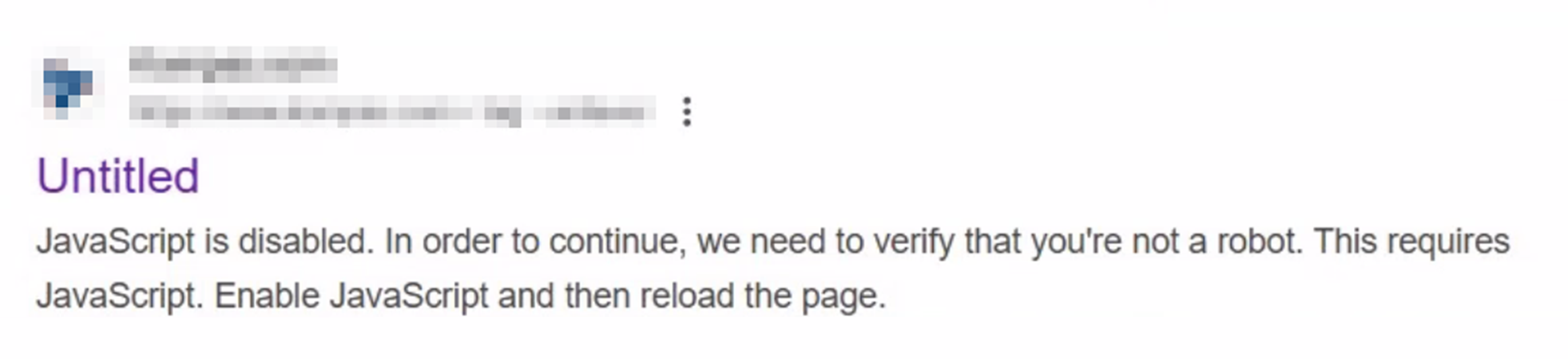 部分搜索引擎的爬虫无法正确处理 JavaScript Challenge。如下图所示,它们可能会直接将 Challenge 响应作为索引内容并显示在搜索结果页面上,严重影响网站的 SEO 表现。