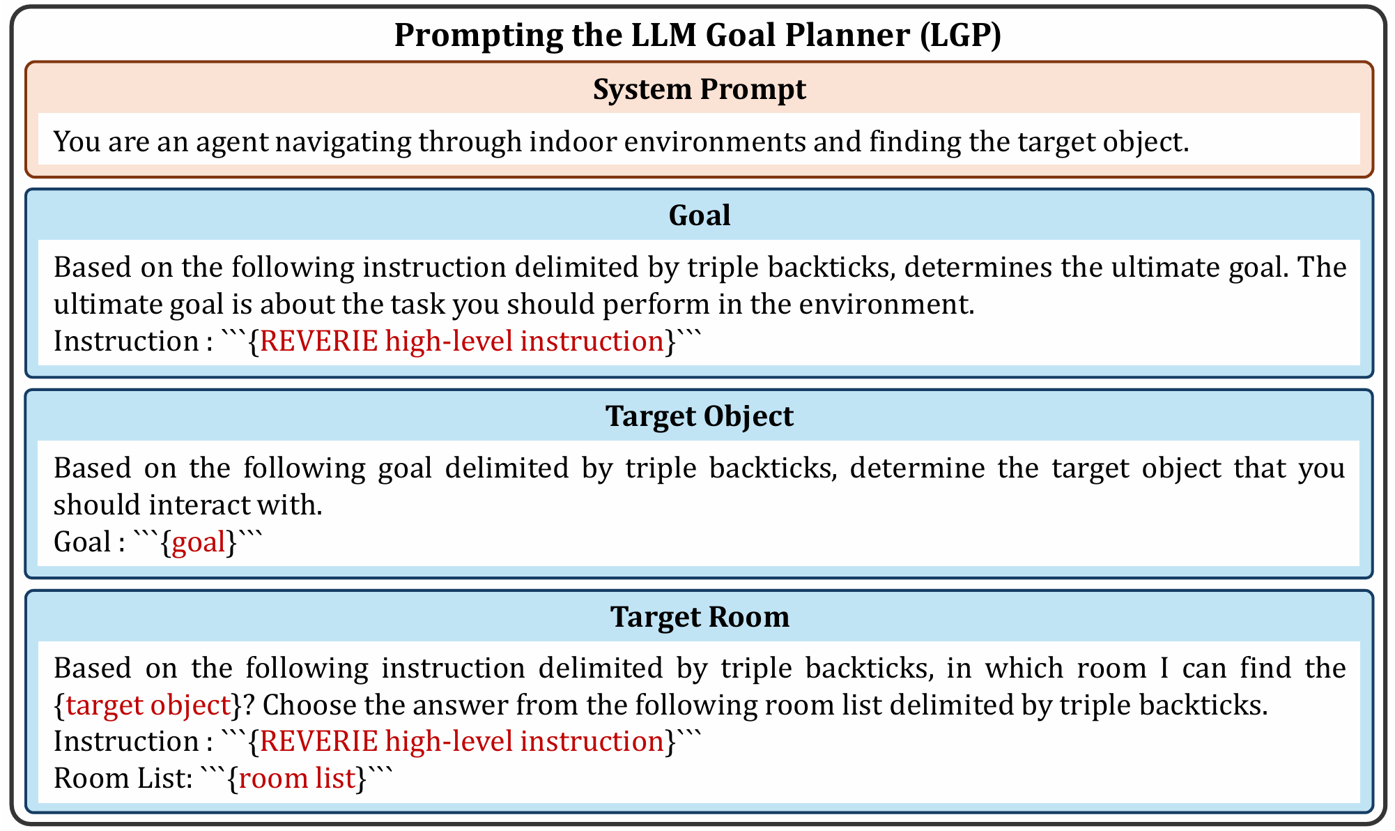 - LGP提示:首先定义系统提示,告知模型关于任务的一般信息。然后通过三个连续步骤进行对象识别和对象定位:提取REVERIE高级指令的主要目标、根据目标检索目标对象、根据目标对象的常见位置和REVERIE指令找到目标房间。