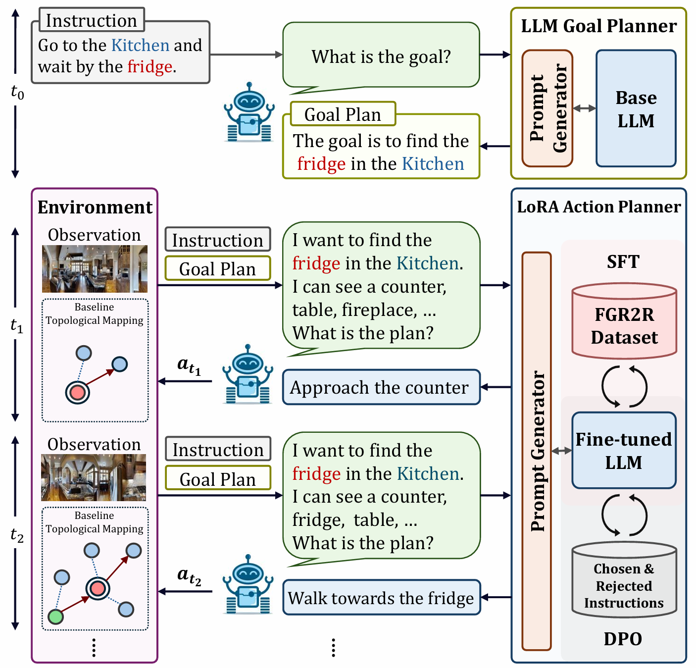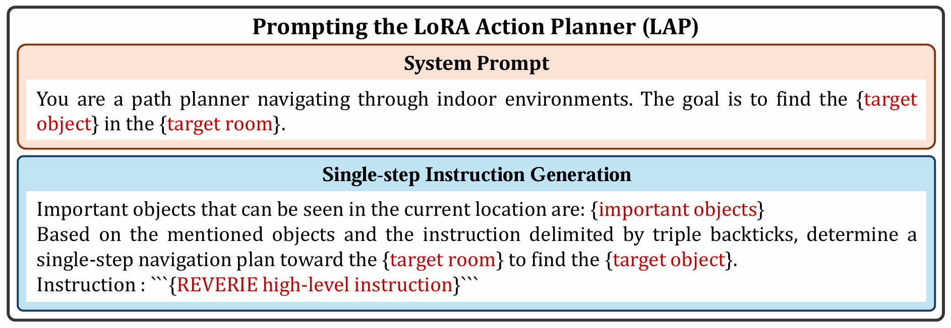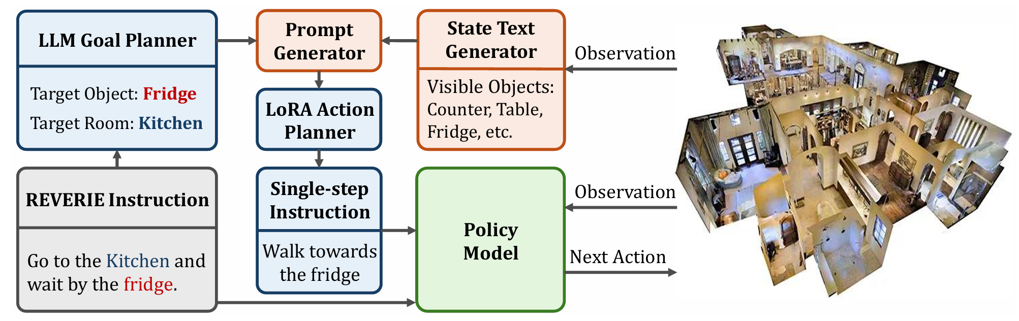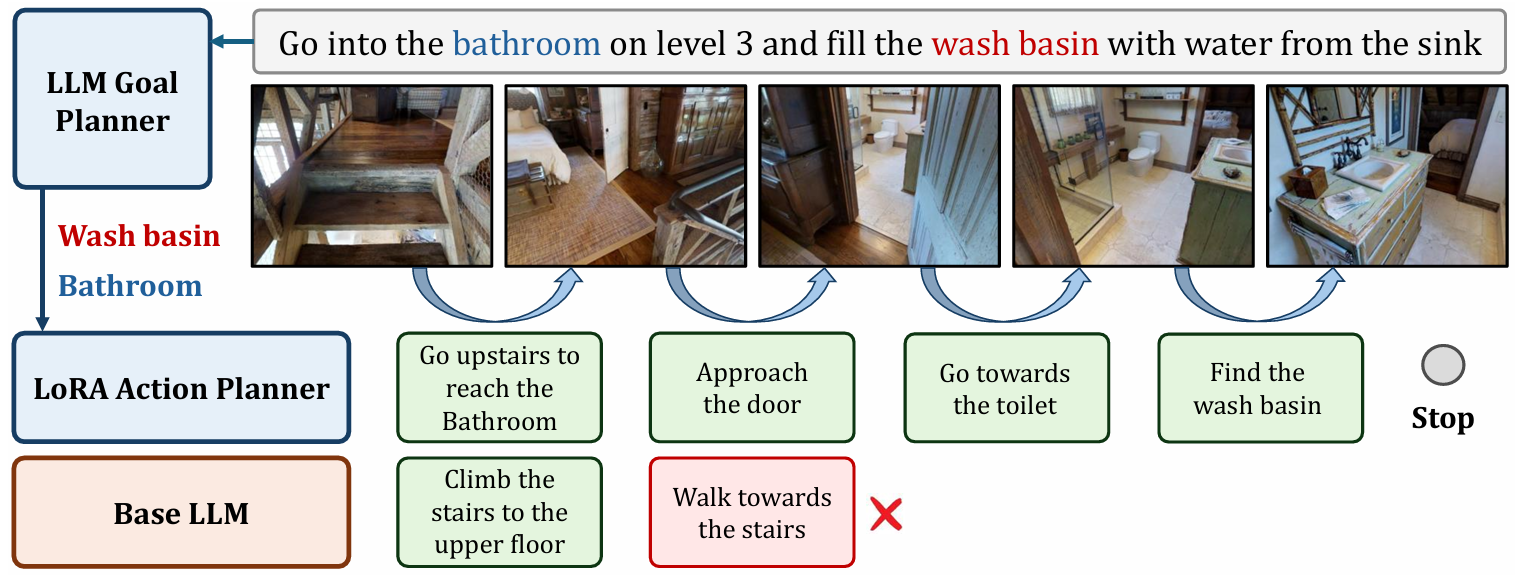 - 设计了LGP和LAP两个模块,LLM目标规划器(LGP)用于从REVERIE指令中提取目标对象和房间;LoRA动作规划器(LAP)用于生成单步动作计划。