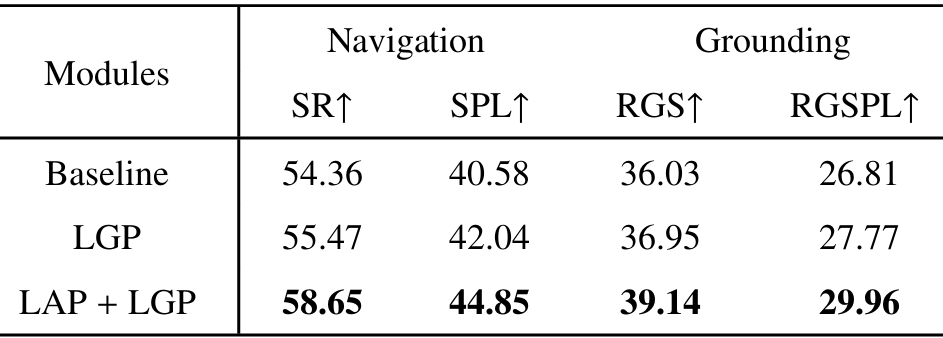 - LGP模块:仅使用LGP时,性能已经比基线有所提升,表明LGP在提取目标对象和房间方面的有效性。