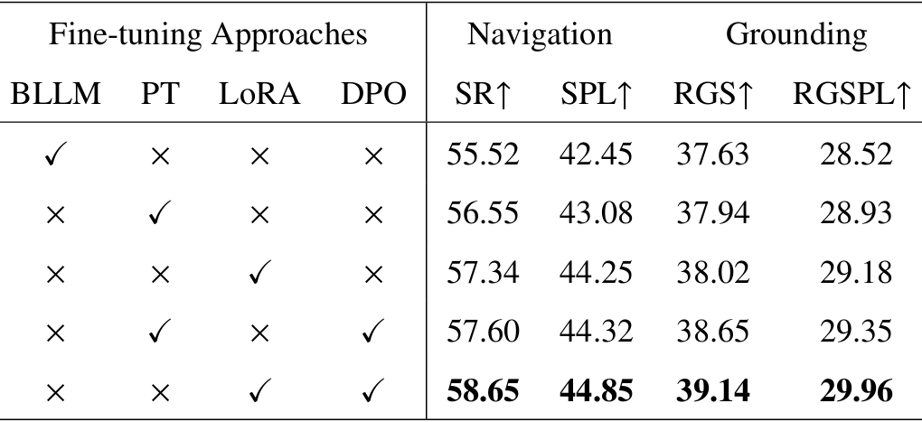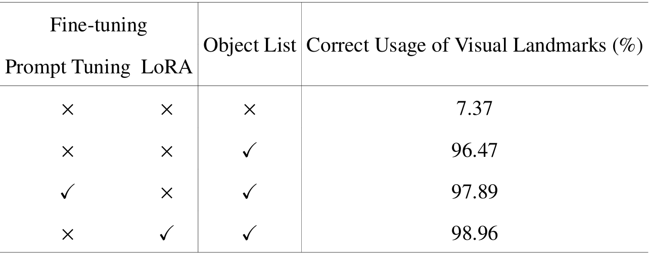 - 视觉地标使用:通过实验表明,定义适当的目标对象列表可以显著提高生成的单步指令中视觉地标的准确性。此外,LLM微调可以进一步提高视觉地标的使用准确性。