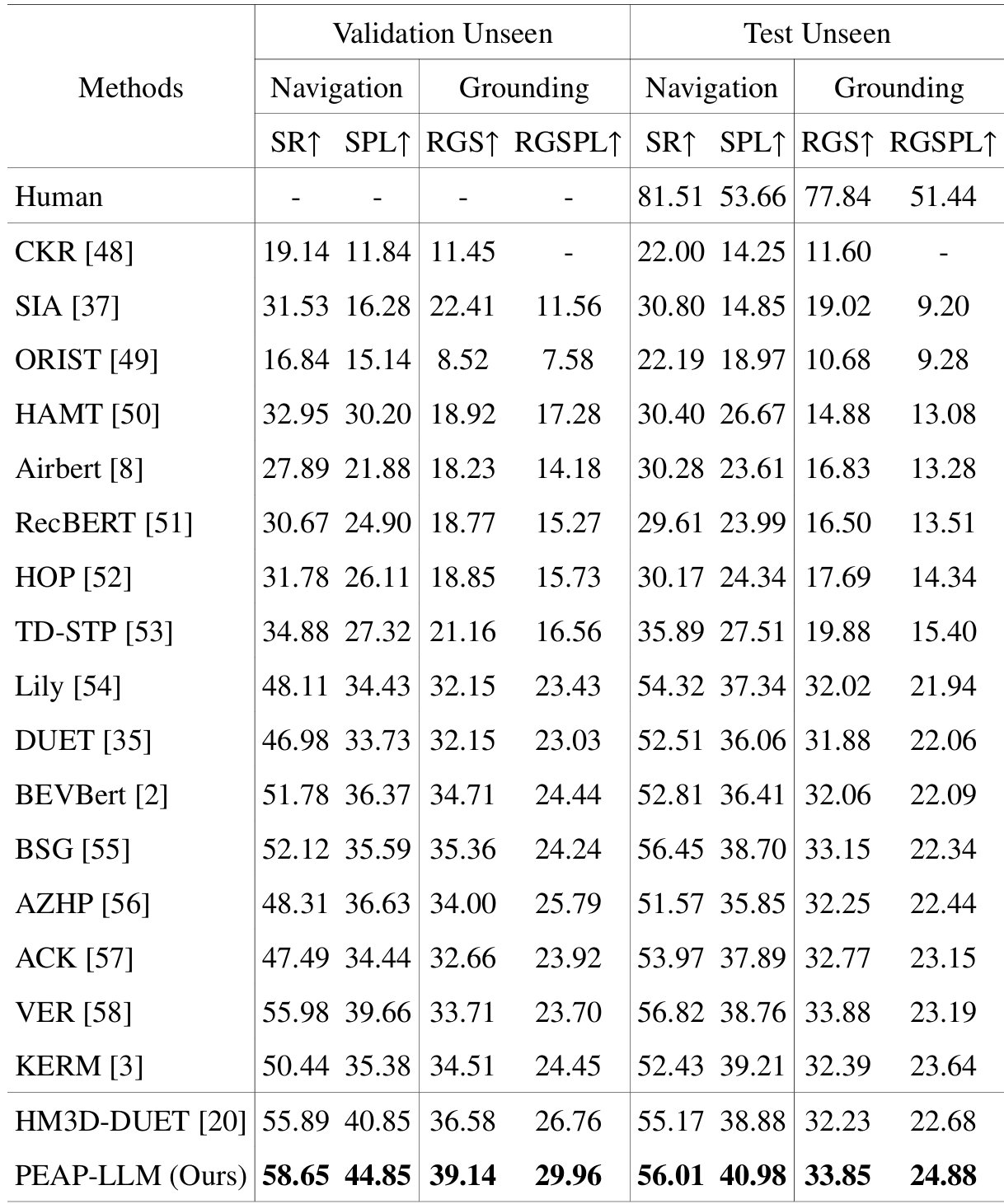 - 与多种SOTA方法(如CKR、SIA、ORIST、HAMT、Airbert、RecBERT、HOP、TD-STP、Lily、DUET、BEVBert、BSG、AZHP、ACK、VER、KERM)进行了比较,PEAP-LLM在所有指标上均取得了最佳性能。