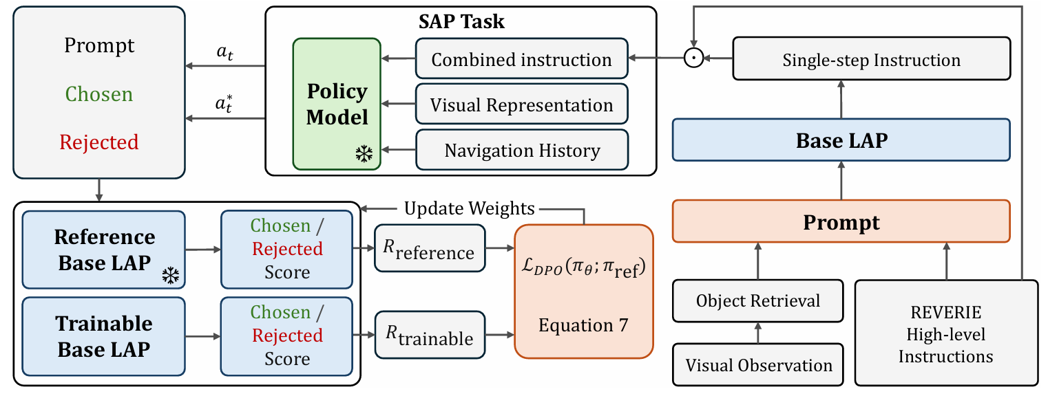 - DPO训练器的策略公式化为最大化偏好响应的概率,同时最小化非偏好响应的概率。参考模型的权重在训练过程中保持冻结,以防止与基础LAP模型偏差过大。