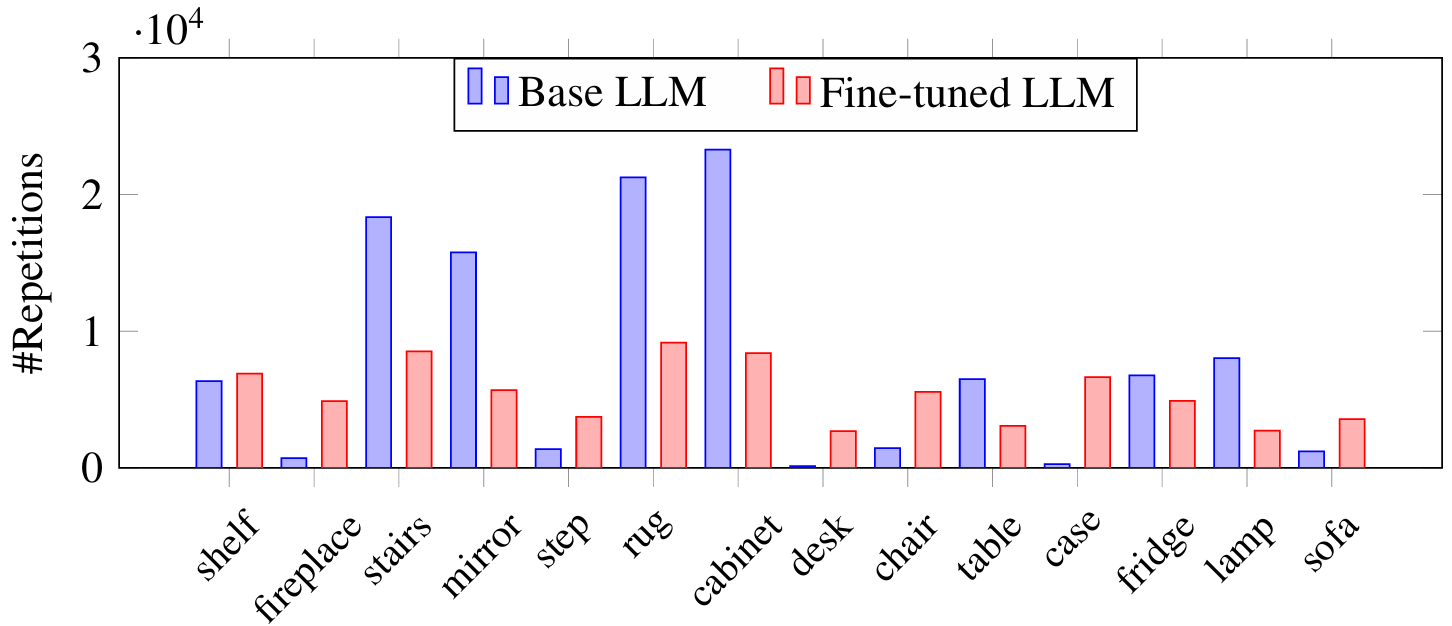 - 对象使用频率:通过统计生成的单步指令中常见对象的使用频率,发现LLM微调可以减少对某些特定对象的偏见,使生成的指令更加平衡。