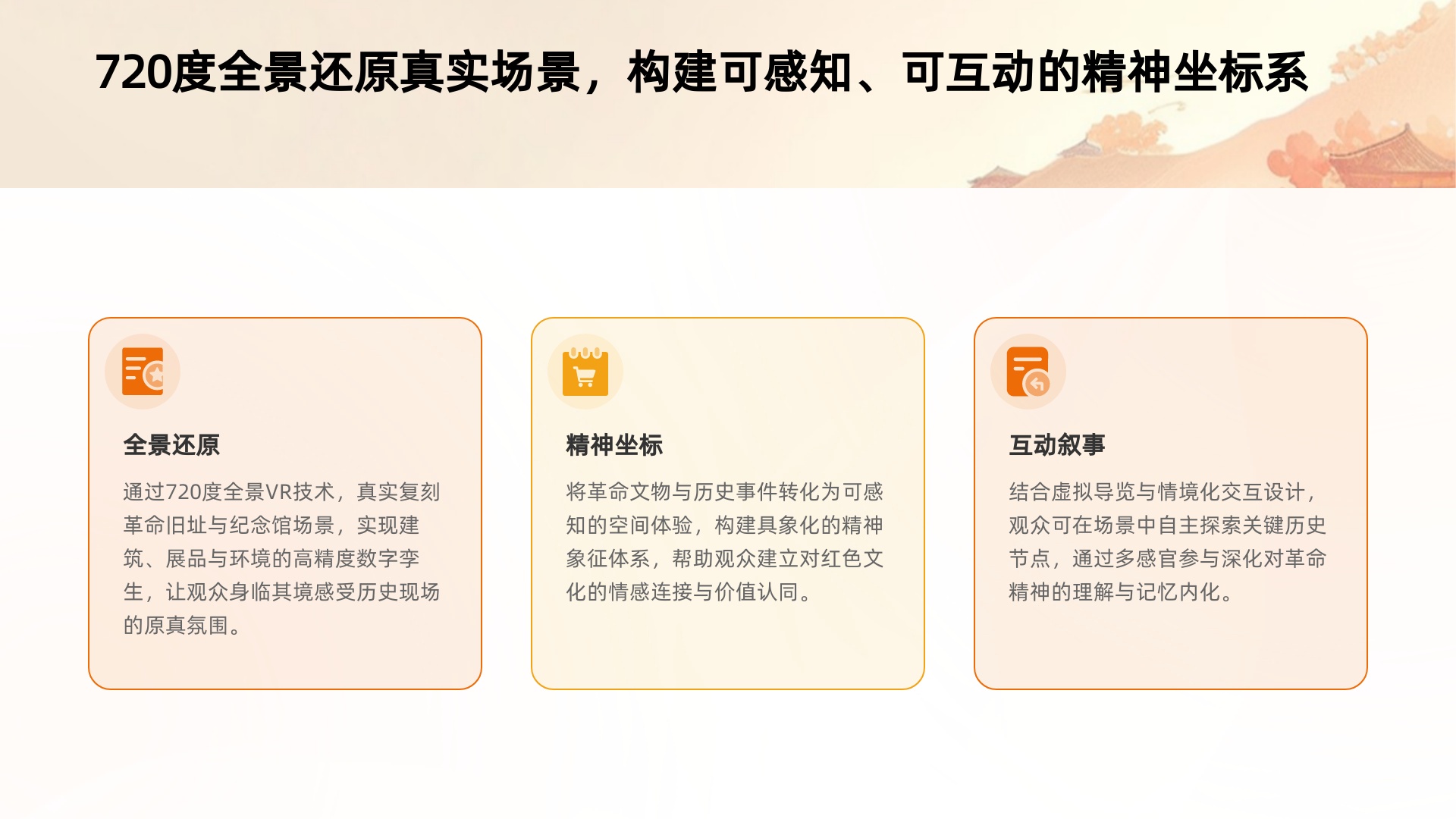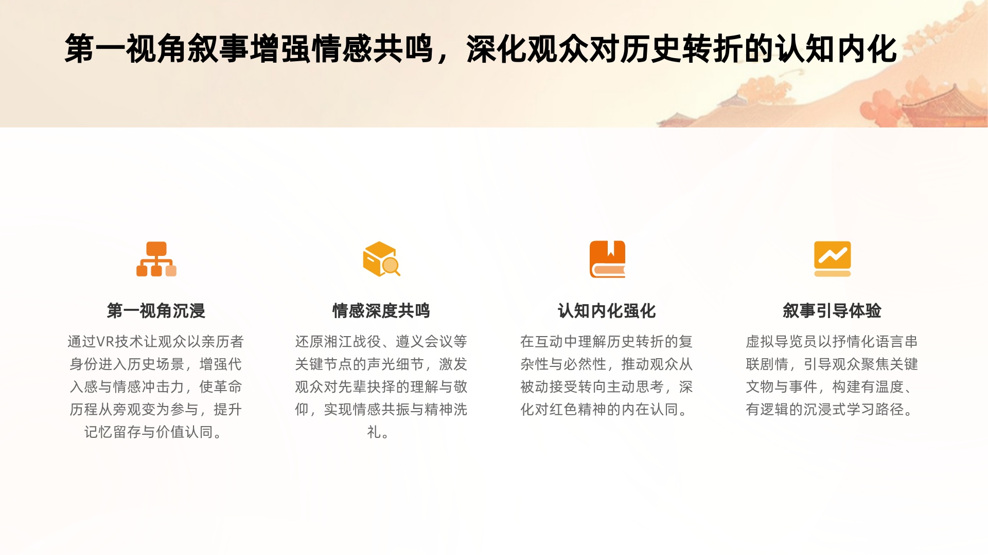 通过 VR 技术构建第一视角体验,让用户以 “亲历者” 身份进入历史场景,将革命历程从 “旁观” 转化为 “参与”:例如还原湘江战役、遵义会议等关键节点的声光细节,直观呈现先辈的抉择困境,激发用户对革命先辈的理解与敬仰;同时,互动设计引导用户主动探索历史转折的复杂性,推动从被动接受信息向主动思考转变,深化对红色精神的内在认同。
