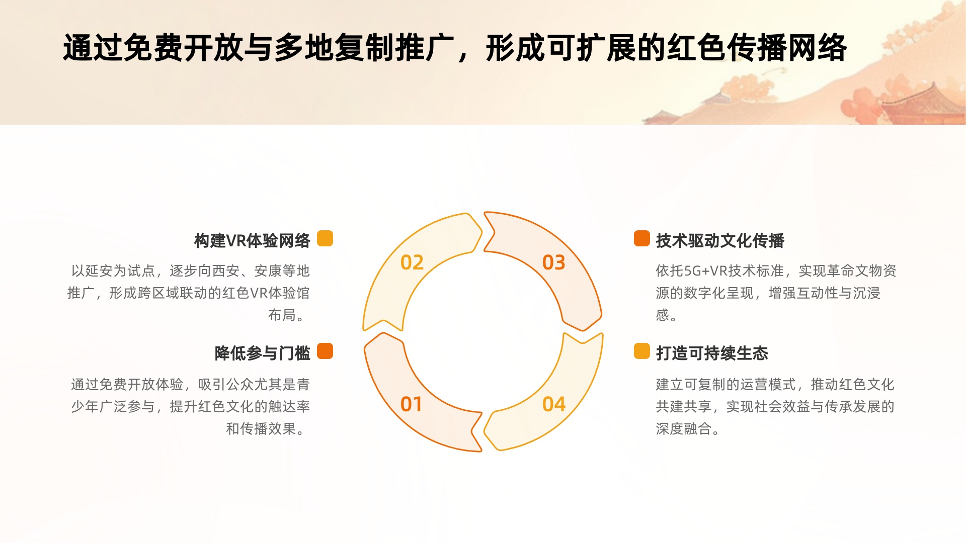 以延安为试点,逐步向西安、安康等城市推广红色 VR 体验馆,形成跨区域联动的布局;通过免费开放 VR 体验的方式,降低公众参与门槛,尤其吸引青少年群体广泛参与,提升红色文化的触达率与传播效果;同时依托 5G+VR 技术标准,确保各地体验馆的内容质量与体验一致性,建立可复制的运营模式,推动红色文化共建共享,实现社会效益与传承发展的深度融合。