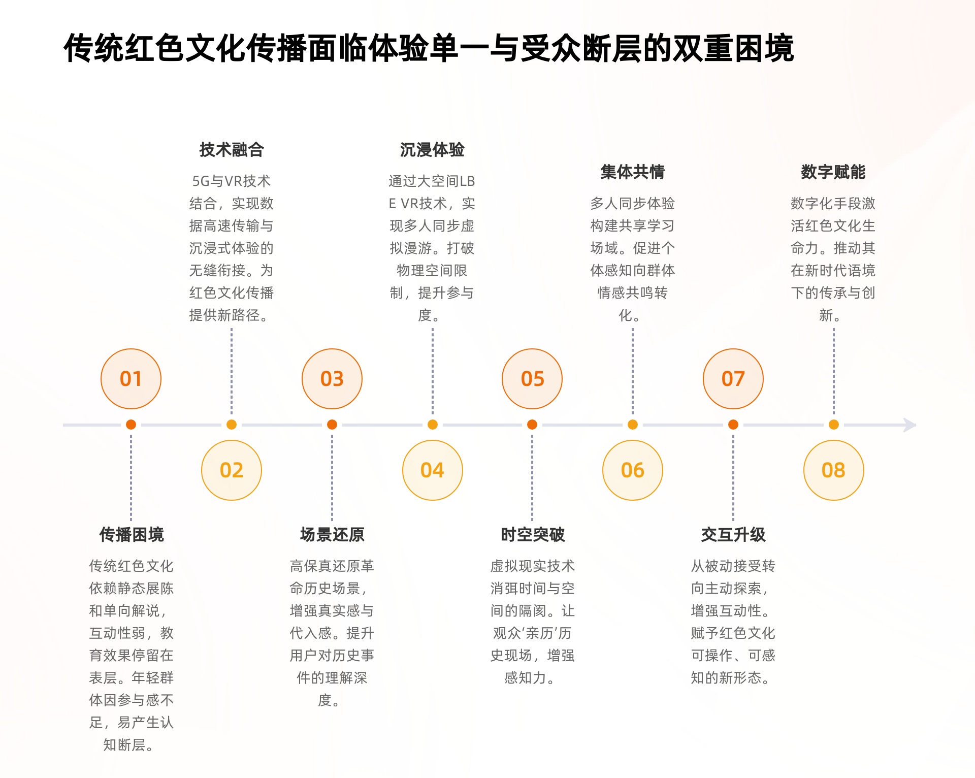 传统红色文化传播长期面临 “体验单一” 与 “受众断层” 的核心问题:传播形式以线下展馆静态陈列、图文或纪录片单向输出为主,受众始终处于 “旁观” 状态,缺乏主动参与和深度交互;单向灌输的模式难以吸引年轻群体,且革命旧址、纪念馆的地域分布限制,进一步降低了红色文化的触达范围与传播效率。