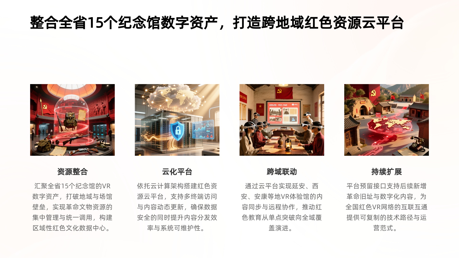 通过整合全省 15 个纪念馆的 VR 数字资产,打破地域与场馆壁垒,构建区域性红色文化数据中心;依托云计算架构搭建红色资源云平台,支持 VR 头显、手机、电脑等多终端访问,同时实现内容动态更新,在保障数据安全的基础上提升内容分发效率;借助云平台实现延安、西安、安康等地 VR 体验馆的内容同步与远程协作,推动红色教育从单点突破向全域覆盖演进,且平台预留接口支持后续新增革命旧址与数字化内容,为全国红色 VR 网络的互联互通提供可复制的技术与运营范式。
