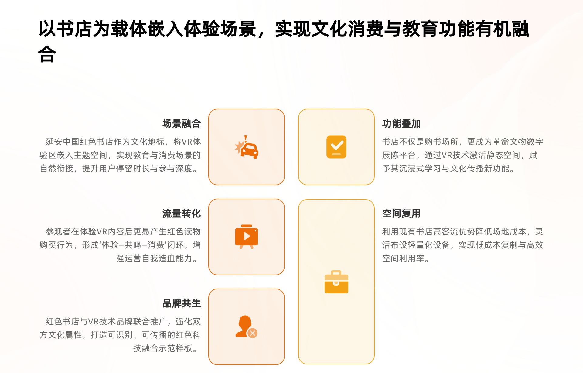以书店为载体嵌入 VR 体验场景,典型案例为延安中国红色书店 —— 在这类文化地标中设置 VR 体验区,实现红色教育与文化消费场景的自然衔接,延长用户停留时长、加深参与深度;这种模式能有效推动流量转化:参观者在体验 VR 红色内容后,对红色文化的认同感与兴趣度提升,更易产生红色读物、红色文创产品的购买行为,形成 “体验 — 共鸣 — 消费” 的运营闭环,增强红色 VR 空间的自我造血能力。