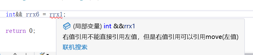 {//左值引用int x = 1;int& a = x;string s("111111");string& ss = s;const int& b = 11;//右值引用double y = 1.0, z = 2.1;int&& i = 0;double&& rr2 = y + z;string&& rr4 = string("11111");return 0;