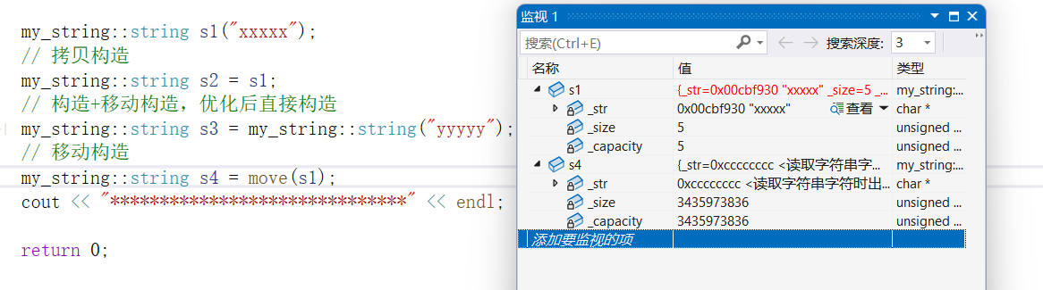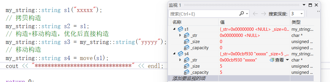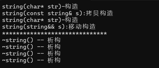 {my_string::string s1("xxxxx");// 拷⻉构造my_string::string s2 = s1;// 构造+移动构造,优化后直接构造my_string::string s3 = my_string::string("yyyyy");// 移动构造my_string::string s4 = move(s1);cout << "******************************" << endl;return 0;