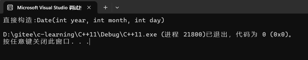 public:Date(int year = 1, int month = 1, int day = 1): _year(year), _month(month), _day(day){cout << "直接构造:Date(int year, int month, int day)" << endl;}Date(initializer_list<int> i1){cout << "initializer_list构造:Date(initializer_list<int> i1)" << endl;}Date(const Date& d): _year(d._year), _month(d._month), _day(d._day){cout << "拷贝构造:Date(const Date& d)" << endl;}private:int _year;int _month;int _day;