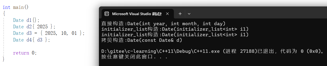 {//C++98支持的int a1[] = { 1, 2, 3, 4, 5 };int a2[5] = { 0 };Point p = { 1, 2 };/*C++11后支持的*///内置类型int x1 = { 2 };//自定义类型Date d1 = { 2025, 10, 01 }; //拷贝列表初始化Date d2{ 2025, 10, 02 }; //直接列表初始化return 0;