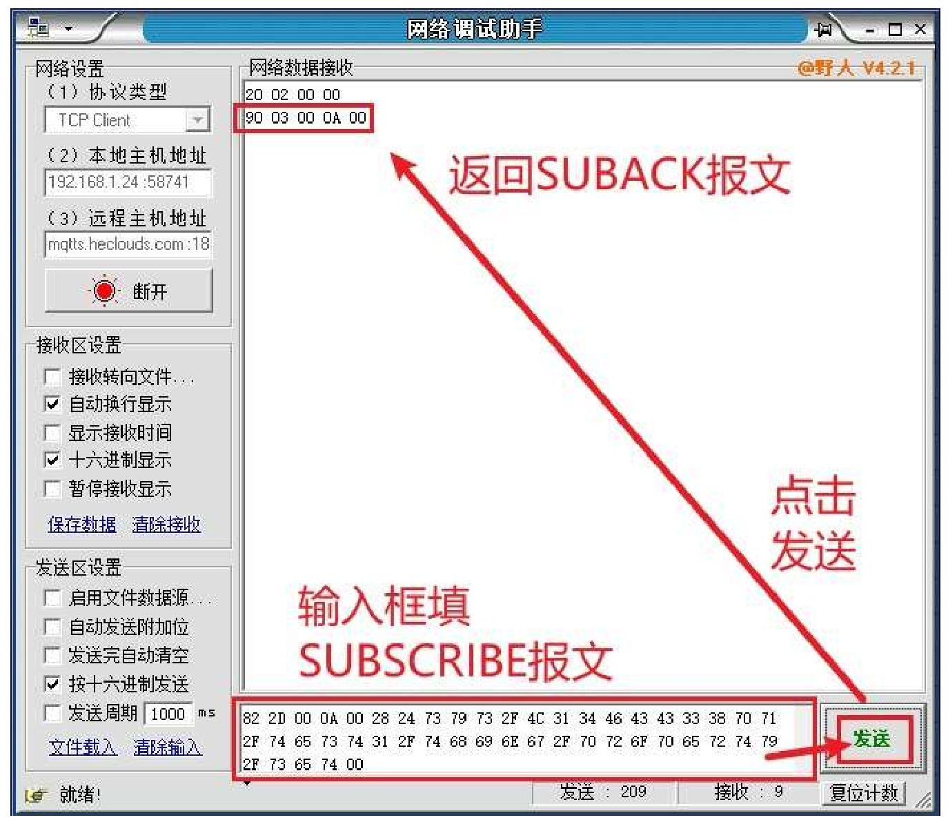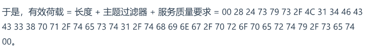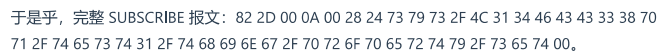 SUBSCRIBE报文的有效载荷的十六进制是:00 28 24 73 79 73 2F 4C 31 34 46 43 43 33 38 70 71 2F 74 65 73 74 312F 74 68 69 6E 67 2F 70 72 6F 70 65 72 74 79 2F 73 65 74 00。