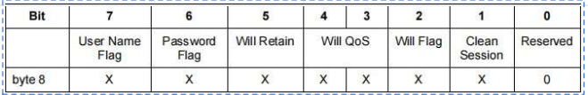 从0到7位分别是保留位(Reserved)、清理会话(Clean Session)、遗嘱标志(Will Flag)、 遗嘱QoS(Wil QoS)、遗嘱保留(Will Retain)、密码标志(Password Flag)、用户名标志 (User Name Flag)。对应位填1则表示有,填0则无。