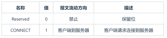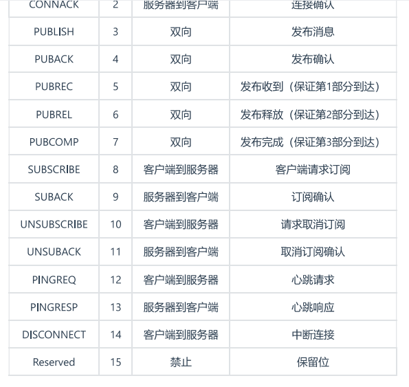 位于byte1的第7~4位,表示MQTT报文类型,有下面这么多类型: