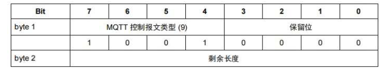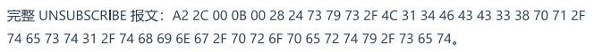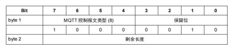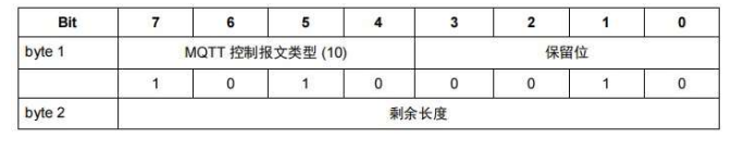 结构如下图,固定报头中消息类型是10,标志位是0010,所以第一字节是10100010,转成十 六进制是A2,剩余长度未知,所以UNSUBSCRIBE报文固定报头的十六进制是:A2 XX。