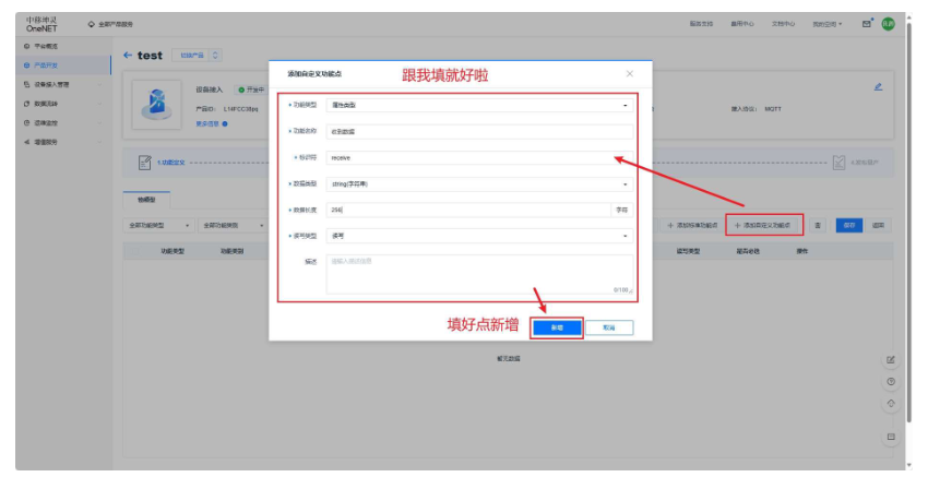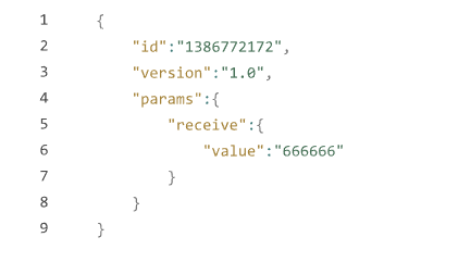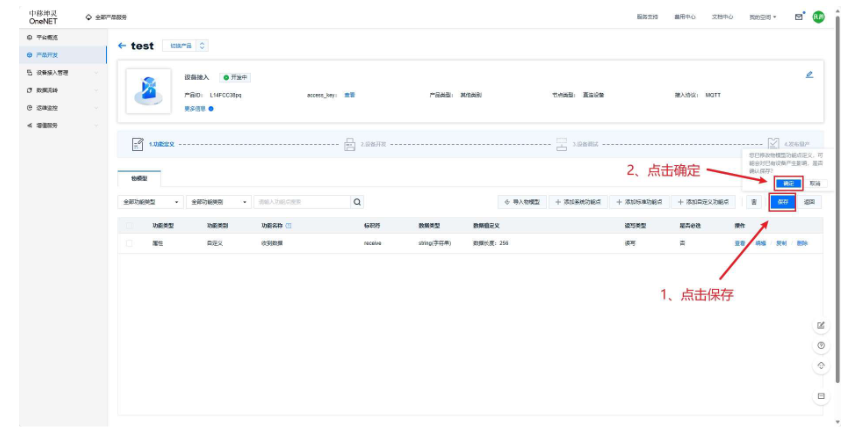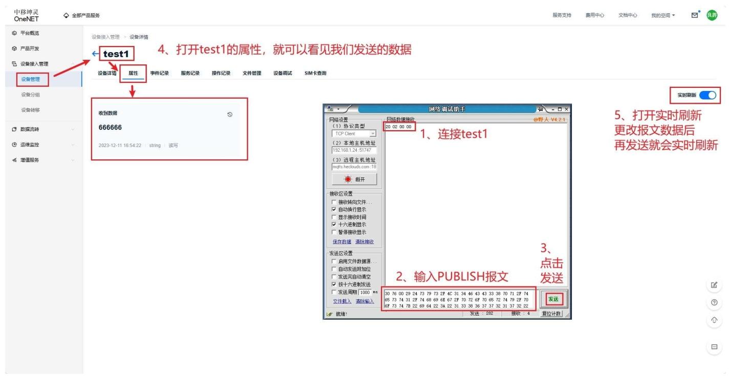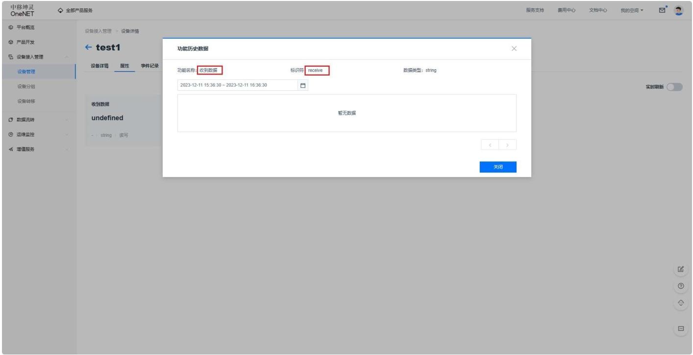 我们就简单点,给test1的物模型"收到数据"发布6个6,要使用标识符receive。这个receive 标识符就是我们在创建产品的时候所设置的属性,还记得吗?